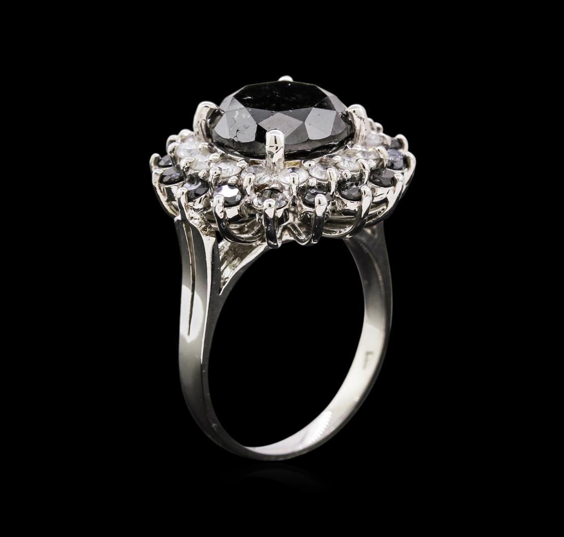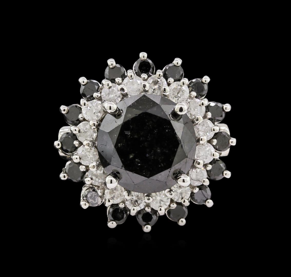 One lady's polished, stamped and electronically tested solid 14k white gold ring mounted with: 1 Genuine Black Diamond, 16 Genuine Black Diamonds and 16 Genuine Diamonds. This item weighs 8.40 grams and fits a finger size 7.25. The setting measures 19.55 x 19.55 mm and the band measures 3.64 mm tapering down to 2.24 mm at the center of the shank. The condition is Brand New. The gemstones have been analyzed in the mounting. Main Gemstone: Identity: Genuine Black Diamond. Cut: round (faceted). Measurements: 10.61-7.85 (est.) (Average). Quantity: 1. Carat Weight: 6.90 cts (est.). Clarity Grade: Opaque. Color Grade: Black. Cut Grade: 5-Good. Second Main Gemstones: Identity: Genuine Diamond. Cut: Round Full (faceted). Measurements: 2.35 x mm (no depth) (Range). Quantity: 16. Carat Weight: 0.74 ctw (est.). Clarity Grade: I-1/I-2. Color Grade: H-I (Average). Cut Grade: 5-Good. Diamond Carat Weight: 7.64ctw. Item Gram Weight: 8.40 grams. GLA Appraised at $18,596.00.