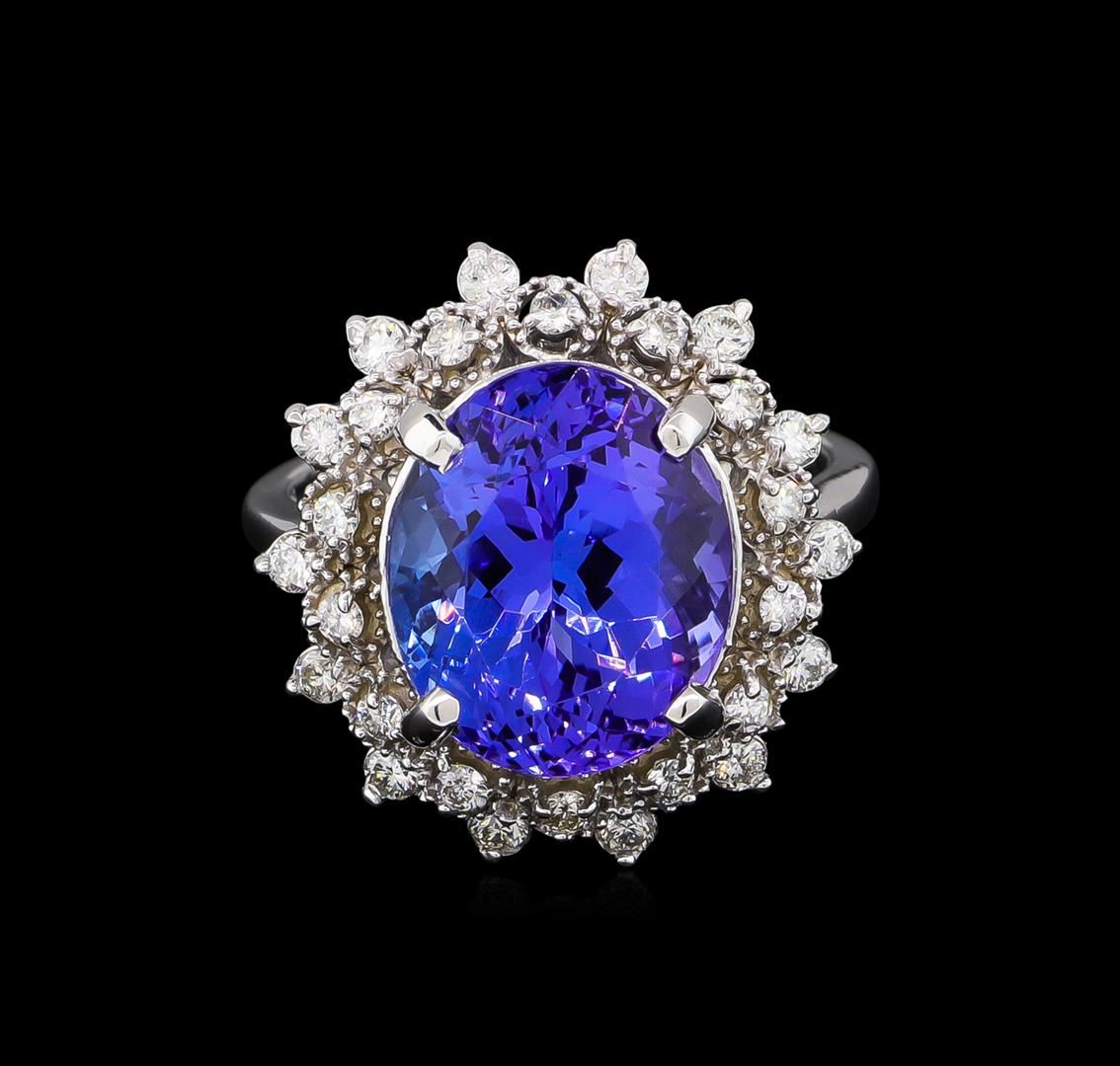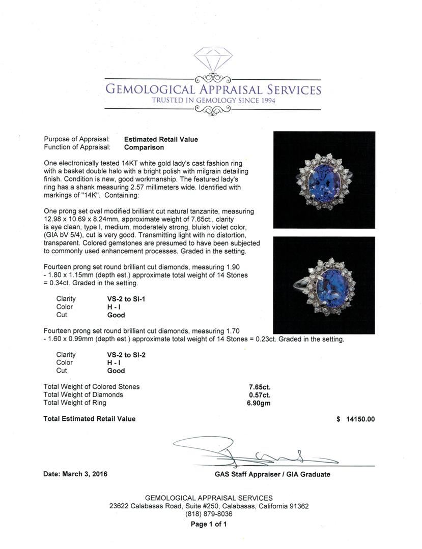 One electronically tested 14KT white gold lady's cast fashion ring with a basket double halo with a bright polish with milgrain detailing finish. The featured lady's ring has a shank measuring 2.57 millimeters wide. Identified with markings of "14K". Condition is new, good workmanship. Containing: One prong set oval modified brilliant cut natural tanzanite, measuring 12.98 x 10.69 x 8.24mm, approximate weight of 7.65ct., clarity is eye clean, type I, medium, moderately strong, bluish violet color, (GIA bV 5/4), cut is very good. Transmitting light with no distortion, transparent. Colored gemstones are presumed to have been subjected to commonly used enhancement processes. Graded in the setting. Fourteen prong set round brilliant cut diamonds, measuring 1.90 - 1.80 x 1.15mm (depth est.) approximate total weight of 14 Stones = 0.34ct. Graded in the setting. Clarity: VS-2 to SI-1. Color: H - I. Cut Good Fourteen prong set round brilliant cut diamonds, measuring 1.70 - 1.60 x 0.99mm (depth est.) approximate total weight of 14 Stones = 0.23ct. Graded in the setting. Clarity: VS-2 to SI-2. Color: H - I. Cut Good. Total Weight of Colored Stones 7.65ct. Total Weight of Diamonds 0.57ct. Total Weight of Ring 6.90gm. GAS Appraised at $14,150.00.