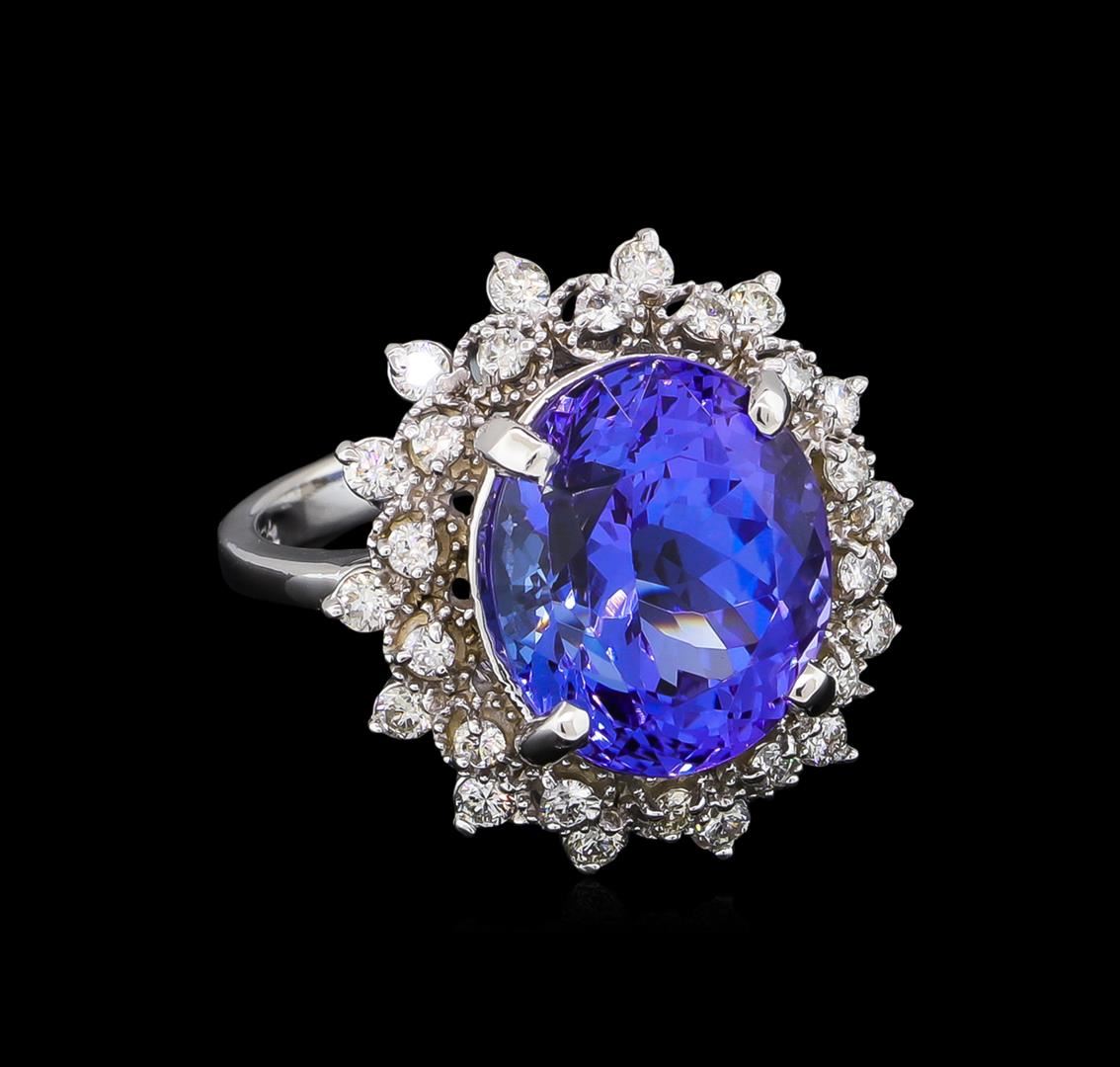 One electronically tested 14KT white gold lady's cast fashion ring with a basket double halo with a bright polish with milgrain detailing finish. The featured lady's ring has a shank measuring 2.57 millimeters wide. Identified with markings of "14K". Condition is new, good workmanship. Containing: One prong set oval modified brilliant cut natural tanzanite, measuring 12.98 x 10.69 x 8.24mm, approximate weight of 7.65ct., clarity is eye clean, type I, medium, moderately strong, bluish violet color, (GIA bV 5/4), cut is very good. Transmitting light with no distortion, transparent. Colored gemstones are presumed to have been subjected to commonly used enhancement processes. Graded in the setting. Fourteen prong set round brilliant cut diamonds, measuring 1.90 - 1.80 x 1.15mm (depth est.) approximate total weight of 14 Stones = 0.34ct. Graded in the setting. Clarity: VS-2 to SI-1. Color: H - I. Cut Good Fourteen prong set round brilliant cut diamonds, measuring 1.70 - 1.60 x 0.99mm (depth est.) approximate total weight of 14 Stones = 0.23ct. Graded in the setting. Clarity: VS-2 to SI-2. Color: H - I. Cut Good. Total Weight of Colored Stones 7.65ct. Total Weight of Diamonds 0.57ct. Total Weight of Ring 6.90gm. GAS Appraised at $14,150.00.