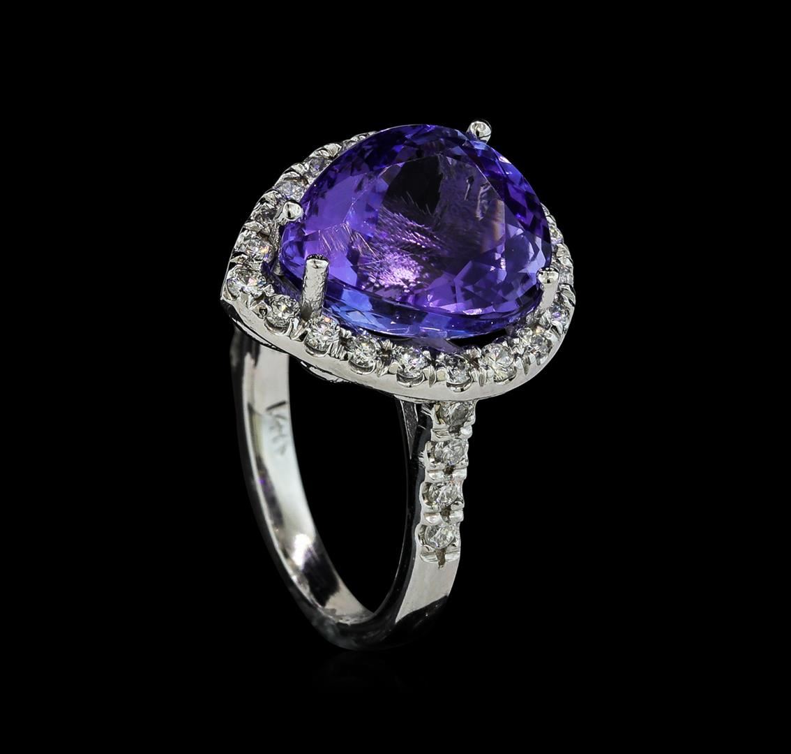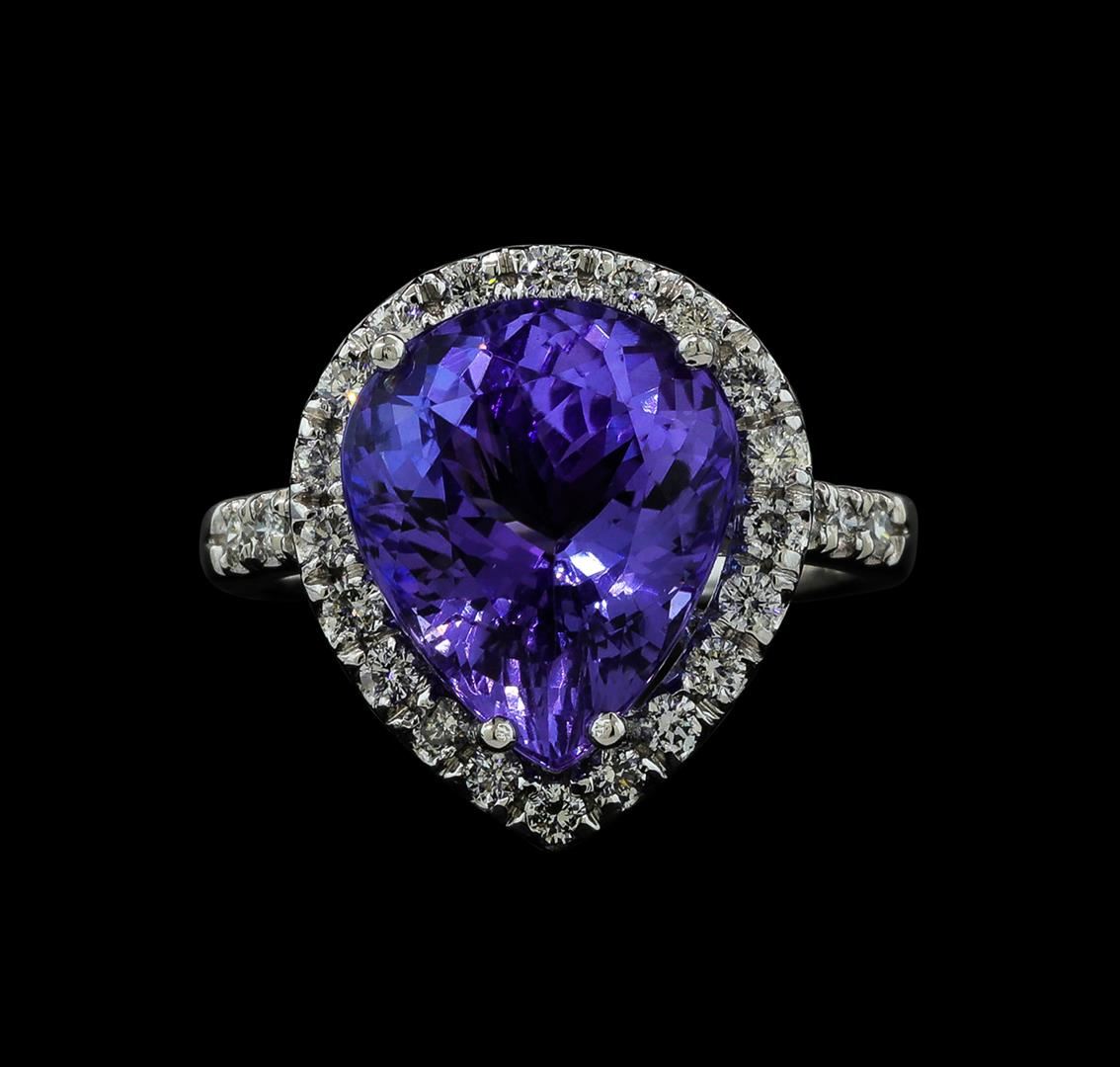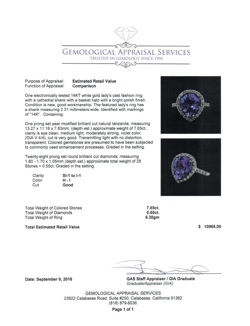 One electronically tested 14KT white gold lady's cast fashion ring with a cathedral shank with a basket halo with a bright polish finish. The featured lady's ring has a shank measuring 2.31 millimeters wide. Identified with markings of '14K'. Condition is new, good workmanship. Containing: One prong set pear modified brilliant cut natural tanzanite, measuring 13.27 x 11.18 x 7.83mm, (depth est.) approximate weight of 7.65ct., clarity is eye clean, medium light, moderately strong, violet color, (GIA V 4/4), cut is very good. Transmitting light with no distortion, transparent. Colored gemstones are presumed to have been subjected to commonly used enhancement processes. Graded in the setting. Twenty-Eight prong set round brilliant cut diamonds, measuring 1.80 - 1.70 x 1.05mm (depth est.) approximate total weight of 28 Stones = 0.55ct. Graded in the setting. Clarity SI-1 to I-1. Color: H - I Cut Good. Total Weight of Colored Stones 7.65ct.. Total Weight of Diamonds 0.55ct.. Total Weight of Ring 6.30gm GAS Appraised at $10,965.00.