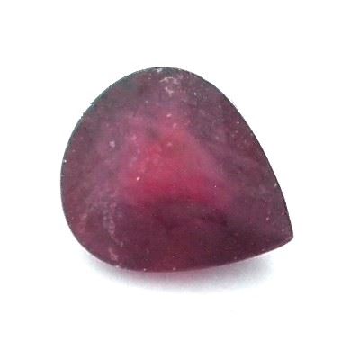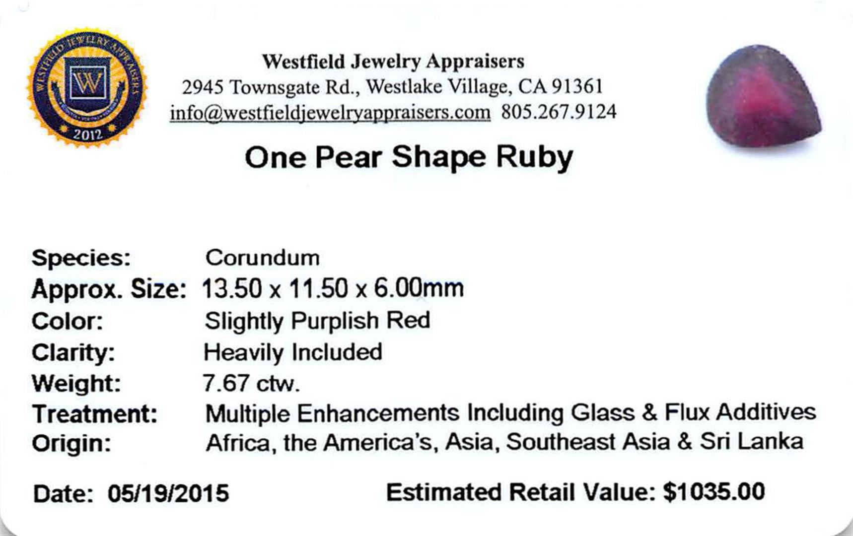 One pear mixed cut natural ruby, measuring 13.50 x 11.50 x 6.00mm, exact weight 7.67ct., clarity is heavily included, type II, medium dark, very slightly brownish, slightly purplish red color, (GIA slpR 6/3), cut is good. Westfield Appraised at $1,035.00.