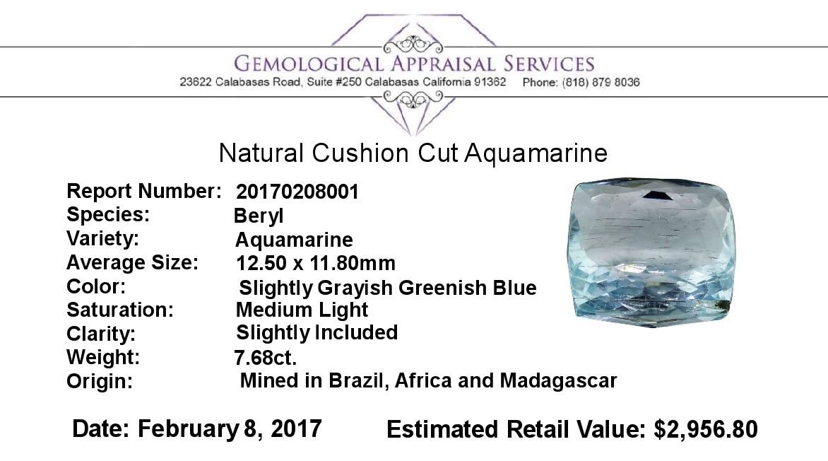 One natural cushion cut aquamarine with an exact weight of 7.68ct., clarity is slightly included, slightly grayish greenish blue, medium light. Gemological Appraisals Services estimates the retail value at $2956.8 GAS Appraised.