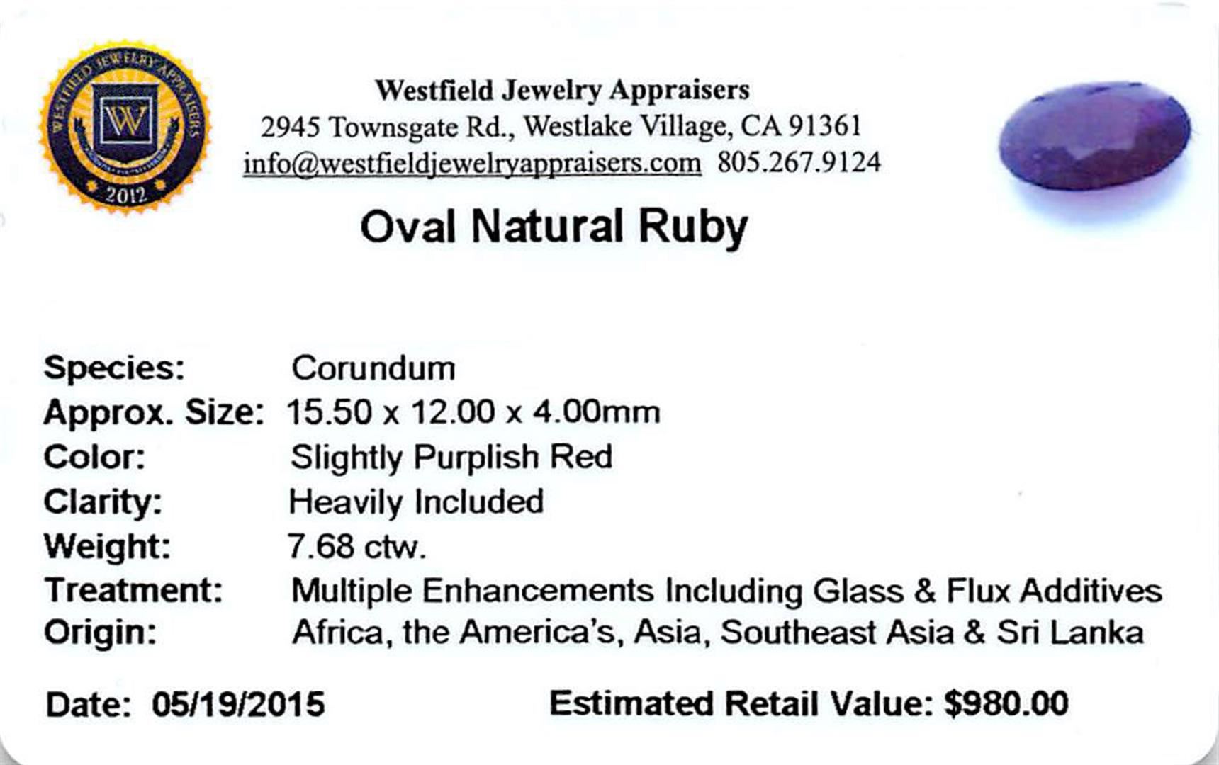 One oval mixed cut natural ruby, measuring 15.50 x 12.00 x 4.00mm, exact weight 7.68ct., clarity is heavily included, type II, dark, very slightly brownish, slightly purplish red color, (GIA slpR 7/3), cut is good. Transmitting light somewhat diffusely, transparent to translucent. Naturally occurring internal & external characteristics are present. Indications of laboratory high temperature heat treatment, with glass & flux additives. Ruby has a low tolerance to rhodium plating, repolishing the surface, & ultrasonic cleaning. Westfield Appraised at $980.00.