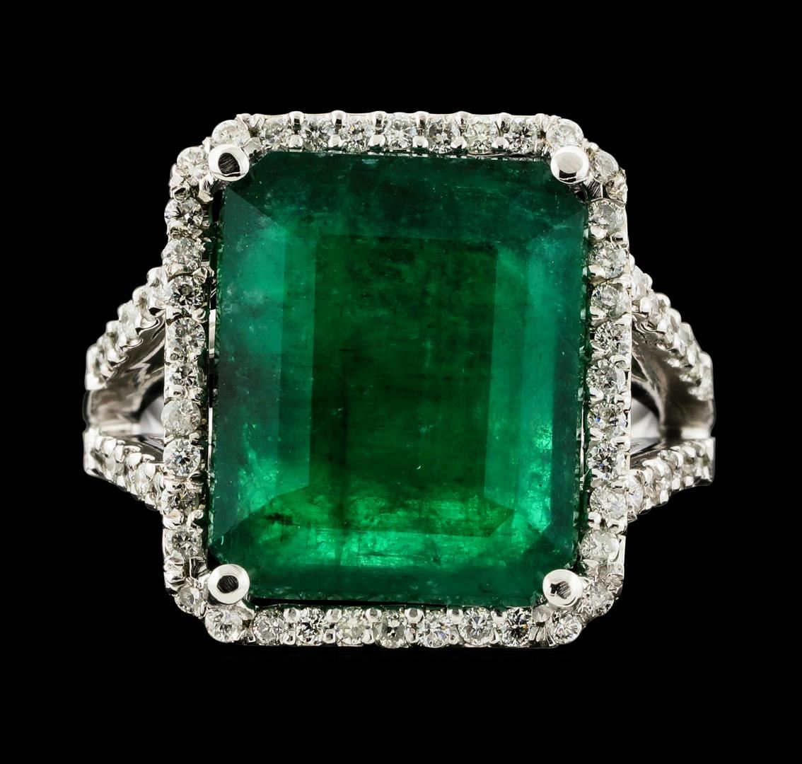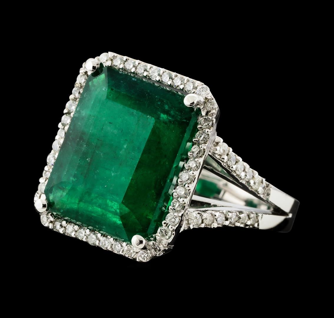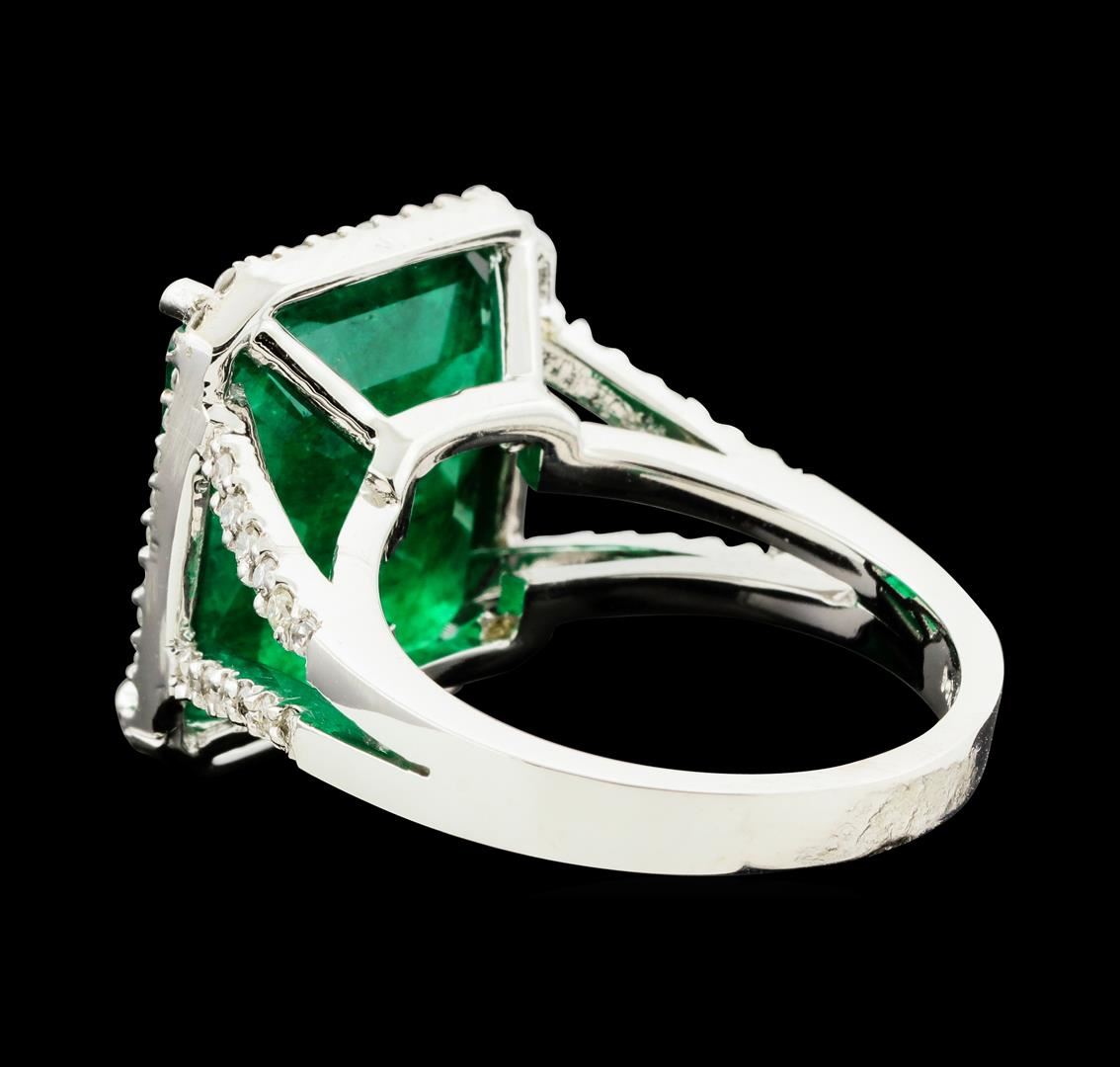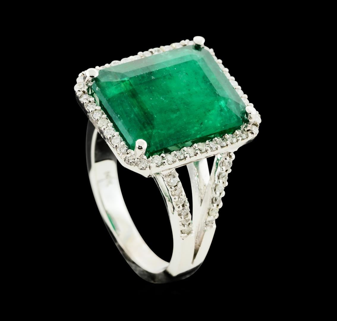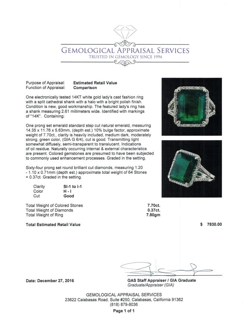 One electronically tested 14KT white gold lady's cast fashion ring with a split cathedral shank with a halo with a bright polish finish. The featured lady's ring has a shank measuring 2.61 millimeters wide. Identified with markings of '14K'. Condition is new, good workmanship. Containing: One prong set emerald standard step cut natural emerald, measuring 14.35 x 11.76 x 5.63mm, (depth est.) 10%. bulge factor, approximate weight of 7.70ct., clarity is heavily included, medium dark, moderately strong, green color, (GIA G 6/4), cut is good. Transmitting light somewhat diffusely, semi-transparent to translucent. Indications of oil residue. Naturally occurring internal & external characteristics are present. Colored gemstones are presumed to have been subjected to commonly used enhancement processes. Graded in the setting. Sixty-Four prong set round brilliant cut diamonds, measuring 1.20 - 1.10 x 0.71mm (depth est.) approximate total weight of 64 Stones = 0.37ct. Graded in the setting. Clarity SI-1 to I-1. Color: H - I Cut Good. Total Weight of Colored Stones 7.70ct.. Total Weight of Diamonds 0.37ct.. Total Weight of Ring 7.80gm. GAS Appraised at $7,830.00.