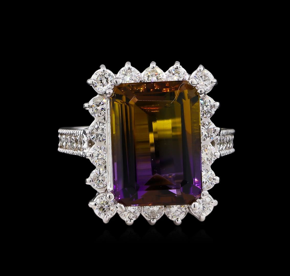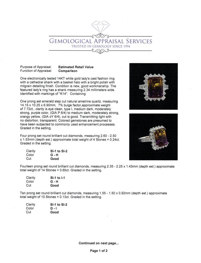 One electronically tested 14KT white gold lady's cast fashion ring with a cathedral shank with a basket halo with a bright polish with milgrain detailing finish. The featured lady's ring has a shank measuring 2.34 millimeters wide. Identified with markings of "K14". Condition is new, good workmanship. Containing: One prong set emerald step cut natural ametrine quartz, measuring 14.15 x 10.25 x 6.90mm, 7%. bulge factor, approximate weight of 7.72ct., clarity is eye clean, type I, medium dark, moderately strong, purple color, (GIA P 6/4) to medium dark, moderately strong, orangy yellow, (GIA oY 6/4), cut is good. Transmitting light with no distortion, transparent. Colored gemstones are presumed to have been subjected to commonly used enhancement processes. Graded in the setting. Four prong set round brilliant cut diamonds, measuring 2.60 - 2.50 x 1.53mm (depth est.) approximate total weight of 4 Stones = 0.24ct. Graded in the setting. Clarity: SI-1 to SI-2. Color: G - Good Fourteen prong set round brilliant cut diamonds, measuring 2.35 - 2.25 x 1.43mm (depth est.) approximate total weight of 14 Stones = 0.65ct. Graded in the setting. Clarity: SI-1 to I-1. Color: G - Good Ten prong set round brilliant cut diamonds, measuring 1.55 - 1.50 x 0.92mm (depth est.) approximate total weight of 10 Stones = 0.13ct. Graded in the setting. Clarity: SI-1 to SI-2. Color: G - I. Cut Good. Total Weight of Colored Stones 7.72ct. Total Weight of Diamonds 1.02ct. Total Weight of Ring 8.60gm GAS Appraised.