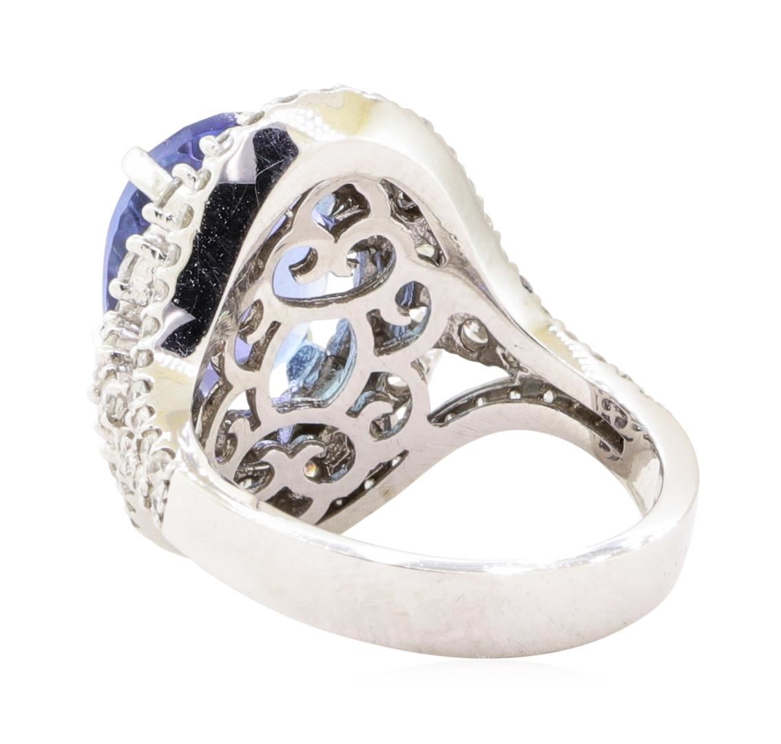 One electronically tested 14KT white gold lady's cast fashion ring with a bright polish finish. The featured lady's ring has a 3.70 millimeter wide shank. Identified with markings of 'K14'. Condition is new, good workmanship. Containing: One prong set oval mixed cut natural tanzanite, measuring 11.69 x 9.56 x 6.40mm, (depth est.) 18%. bulge factor, approximate weight of 5.96ct., clarity is eye clean, medium dark, moderately strong, bluish violet color, (GIA bV 6/4), cut is very good. Colored gemstones are presumed to have been subjected to commonly used enhancement processes. Graded in the setting. Seventy-Eight shared prong set round brilliant cut diamonds, measuring 1.45 - 1.40 x 0.89mm (depth est.) approximate total weight of 78 Stones = 0.87ct. Graded in the setting. Color H - I Clarity SI-1 to I-1 Cut Good Eighteen prong set round brilliant cut diamonds, measuring 2.30 - 2.25 x 1.48mm (depth est.) approximate total weight of 18 Stones = 0.86ct. Graded in the setting. Color H - I Clarity SI-1 to SI-2 Cut Good Two prong set round brilliant cut diamonds, measuring 1.55 - 1.55 x 1.01mm (depth est.) approximate total weight of 2 Stones = 0.03ct. Graded in the setting. Color H - I Clarity SI-1 to SI-2 Cut Good. Total Weight of Colored Stones 5.96ct.. Total Weight of Diamonds 1.76ct.. Total Weight of Ring 8.90gm GAS Appraised at $13985.00. GAS Appraised.