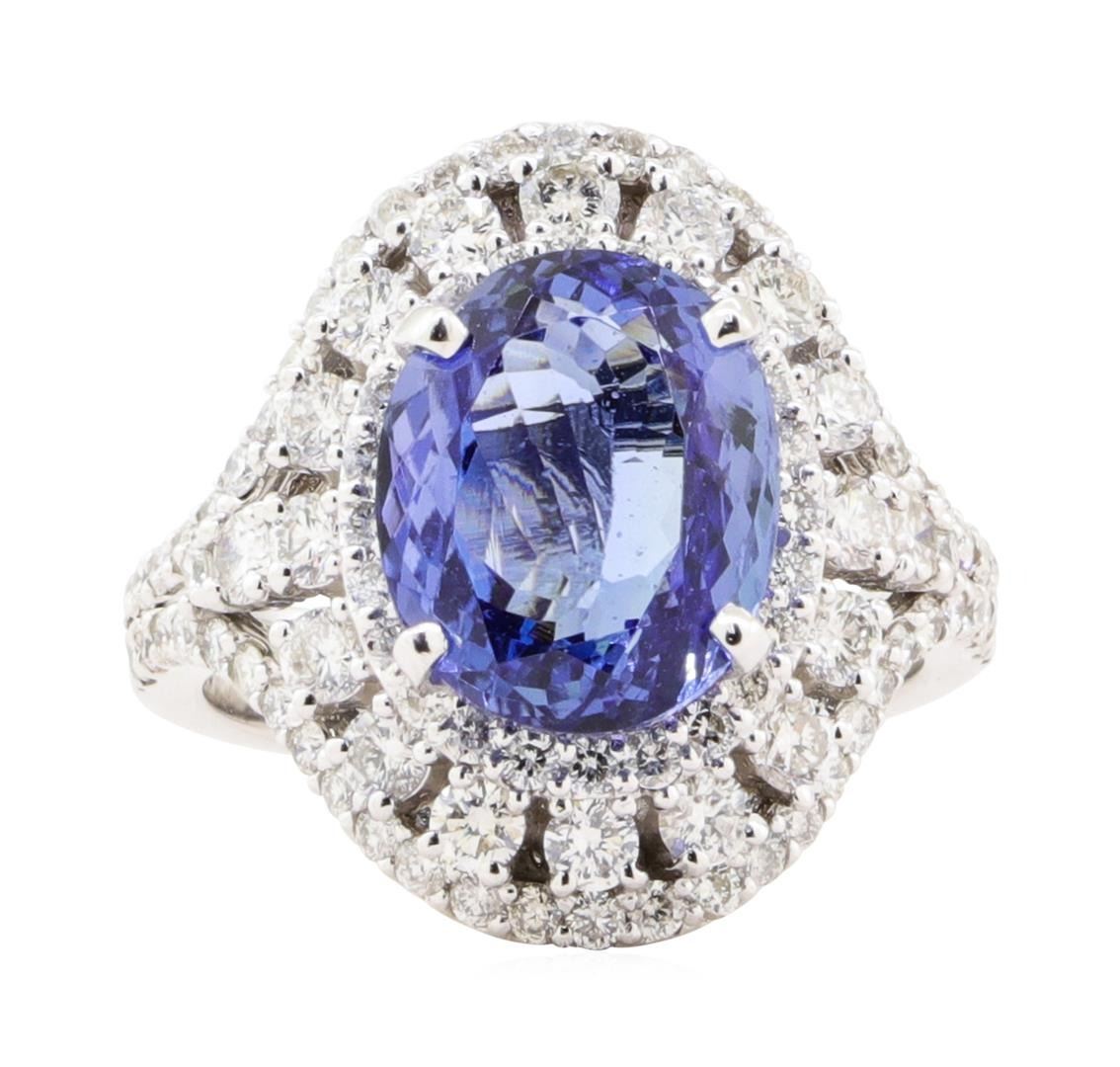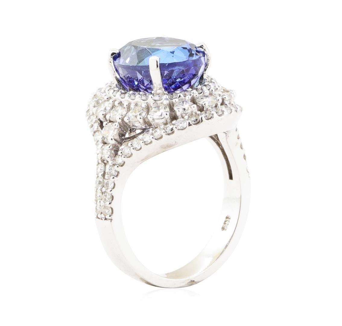One electronically tested 14KT white gold lady's cast fashion ring with a bright polish finish. The featured lady's ring has a 3.70 millimeter wide shank. Identified with markings of 'K14'. Condition is new, good workmanship. Containing: One prong set oval mixed cut natural tanzanite, measuring 11.69 x 9.56 x 6.40mm, (depth est.) 18%. bulge factor, approximate weight of 5.96ct., clarity is eye clean, medium dark, moderately strong, bluish violet color, (GIA bV 6/4), cut is very good. Colored gemstones are presumed to have been subjected to commonly used enhancement processes. Graded in the setting. Seventy-Eight shared prong set round brilliant cut diamonds, measuring 1.45 - 1.40 x 0.89mm (depth est.) approximate total weight of 78 Stones = 0.87ct. Graded in the setting. Color H - I Clarity SI-1 to I-1 Cut Good Eighteen prong set round brilliant cut diamonds, measuring 2.30 - 2.25 x 1.48mm (depth est.) approximate total weight of 18 Stones = 0.86ct. Graded in the setting. Color H - I Clarity SI-1 to SI-2 Cut Good Two prong set round brilliant cut diamonds, measuring 1.55 - 1.55 x 1.01mm (depth est.) approximate total weight of 2 Stones = 0.03ct. Graded in the setting. Color H - I Clarity SI-1 to SI-2 Cut Good. Total Weight of Colored Stones 5.96ct.. Total Weight of Diamonds 1.76ct.. Total Weight of Ring 8.90gm GAS Appraised at $13985.00. GAS Appraised.
