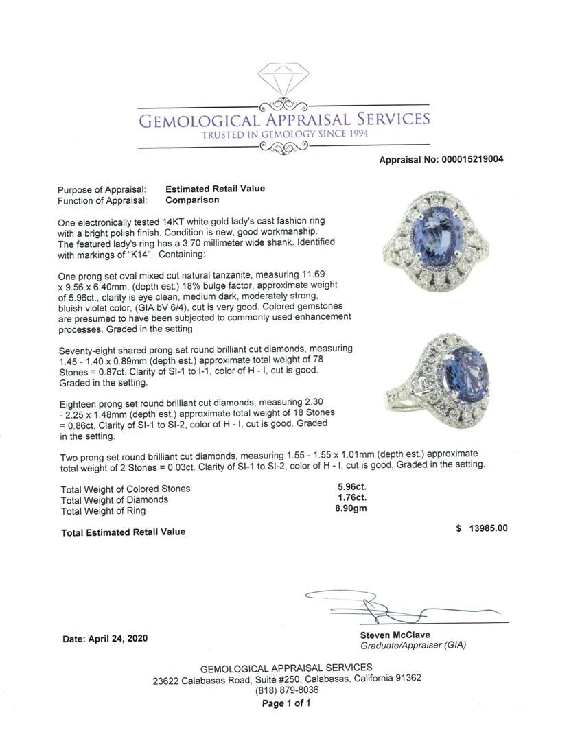 One electronically tested 14KT white gold lady's cast fashion ring with a bright polish finish. The featured lady's ring has a 3.70 millimeter wide shank. Identified with markings of 'K14'. Condition is new, good workmanship. Containing: One prong set oval mixed cut natural tanzanite, measuring 11.69 x 9.56 x 6.40mm, (depth est.) 18%. bulge factor, approximate weight of 5.96ct., clarity is eye clean, medium dark, moderately strong, bluish violet color, (GIA bV 6/4), cut is very good. Colored gemstones are presumed to have been subjected to commonly used enhancement processes. Graded in the setting. Seventy-Eight shared prong set round brilliant cut diamonds, measuring 1.45 - 1.40 x 0.89mm (depth est.) approximate total weight of 78 Stones = 0.87ct. Graded in the setting. Color H - I Clarity SI-1 to I-1 Cut Good Eighteen prong set round brilliant cut diamonds, measuring 2.30 - 2.25 x 1.48mm (depth est.) approximate total weight of 18 Stones = 0.86ct. Graded in the setting. Color H - I Clarity SI-1 to SI-2 Cut Good Two prong set round brilliant cut diamonds, measuring 1.55 - 1.55 x 1.01mm (depth est.) approximate total weight of 2 Stones = 0.03ct. Graded in the setting. Color H - I Clarity SI-1 to SI-2 Cut Good. Total Weight of Colored Stones 5.96ct.. Total Weight of Diamonds 1.76ct.. Total Weight of Ring 8.90gm GAS Appraised at $13985.00. GAS Appraised.