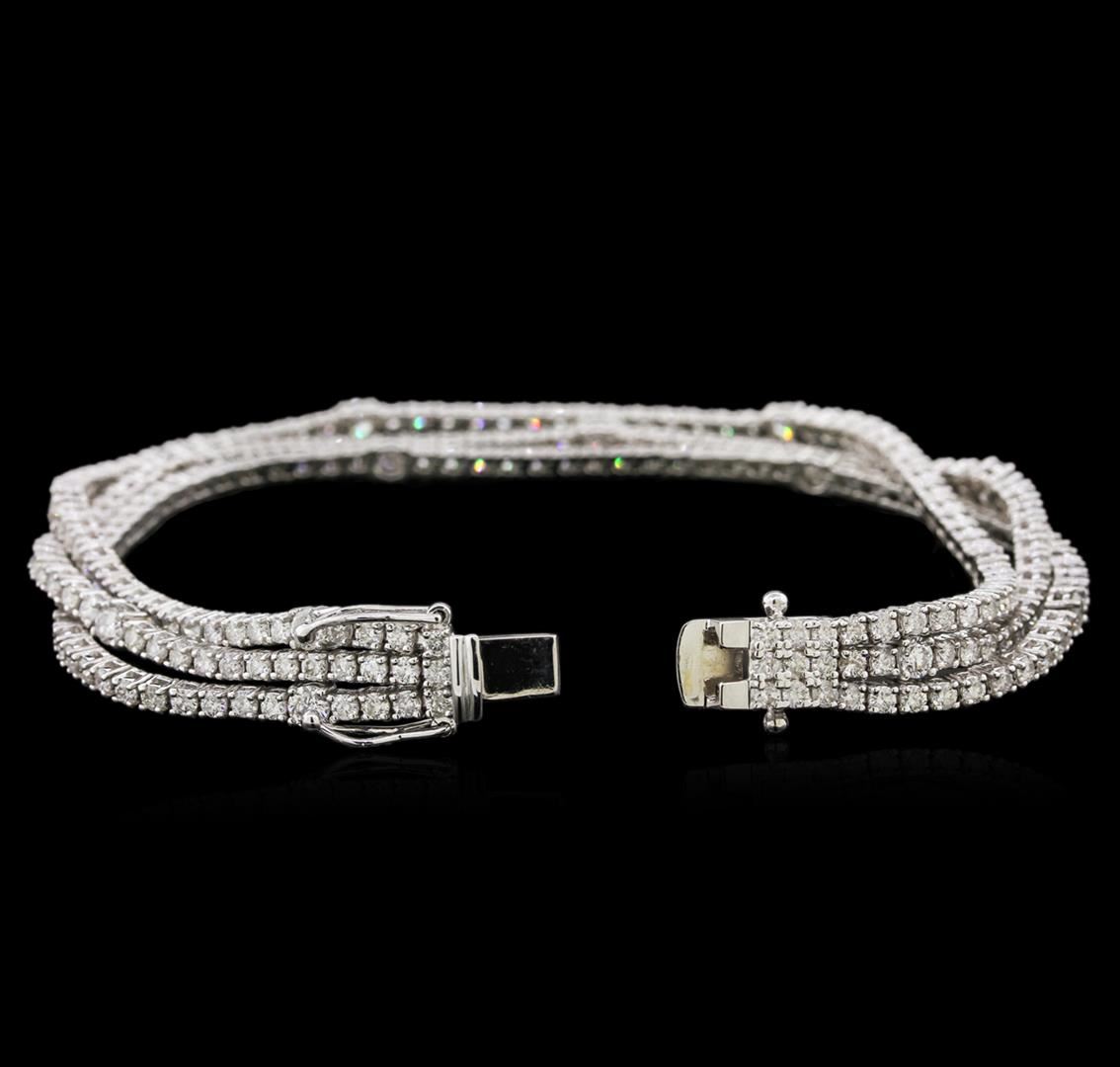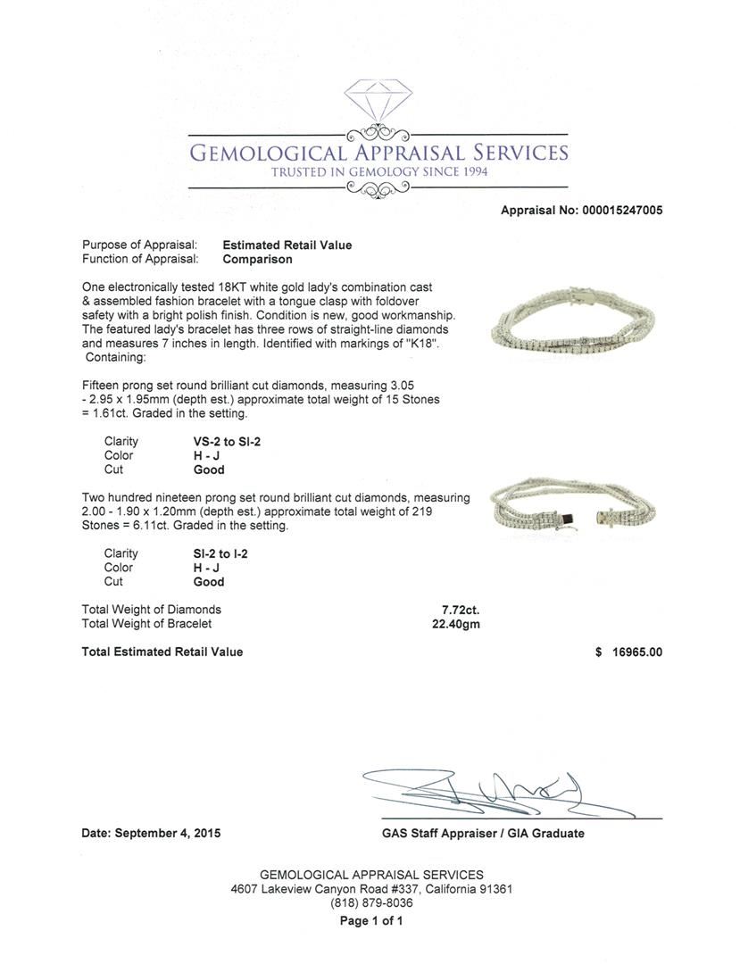One electronically tested 18KT white gold lady's combination cast & assembled fashion bracelet with a tongue clasp with foldover safety with a bright polish finish. The featured lady's bracelet has three rows of straight-line diamonds and measures 7 inches in length. Identified with markings of "K18". Condition is new, good workmanship. Containing: Fifteen prong set round brilliant cut diamonds, measuring 3.05 - 2.95 x 1.95mm (depth est.) approximate total weight of 15 Stones = 1.61ct. Graded in the setting. Clarity: VS-2 to SI-2. Color: H - Good Two Hundred Nineteen prong set round brilliant cut diamonds, measuring 2.00 - 1.90 x 1.20mm (depth est.) approximate total weight of 219 Stones = 6.11ct. Graded in the setting. Clarity: SI-2 to I-2. Color: H - Good. Total Weight of Diamonds 7.72ct. Total Weight of Bracelet 22.40gm. GAS Appraised at $16,965.00.