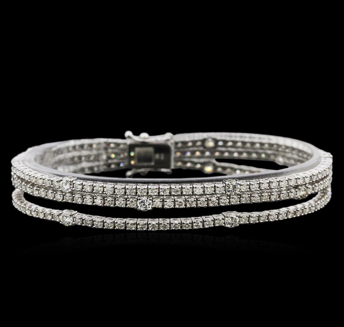 One electronically tested 18KT white gold lady's combination cast & assembled fashion bracelet with a tongue clasp with foldover safety with a bright polish finish. The featured lady's bracelet has three rows of straight-line diamonds and measures 7 inches in length. Identified with markings of "K18". Condition is new, good workmanship. Containing: Fifteen prong set round brilliant cut diamonds, measuring 3.05 - 2.95 x 1.95mm (depth est.) approximate total weight of 15 Stones = 1.61ct. Graded in the setting. Clarity: VS-2 to SI-2. Color: H - Good Two Hundred Nineteen prong set round brilliant cut diamonds, measuring 2.00 - 1.90 x 1.20mm (depth est.) approximate total weight of 219 Stones = 6.11ct. Graded in the setting. Clarity: SI-2 to I-2. Color: H - Good. Total Weight of Diamonds 7.72ct. Total Weight of Bracelet 22.40gm. GAS Appraised at $16,965.00.