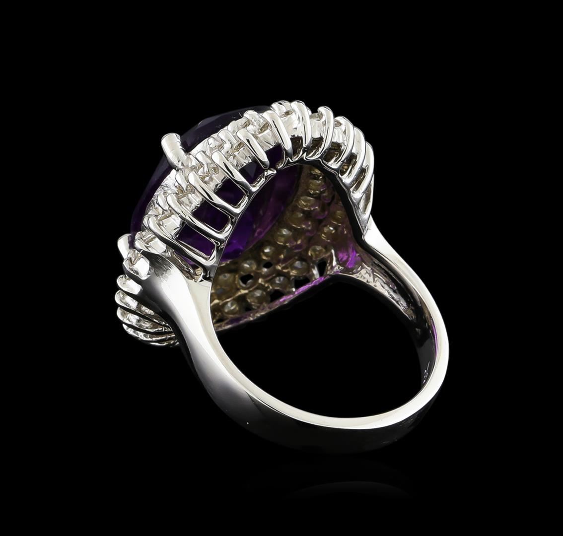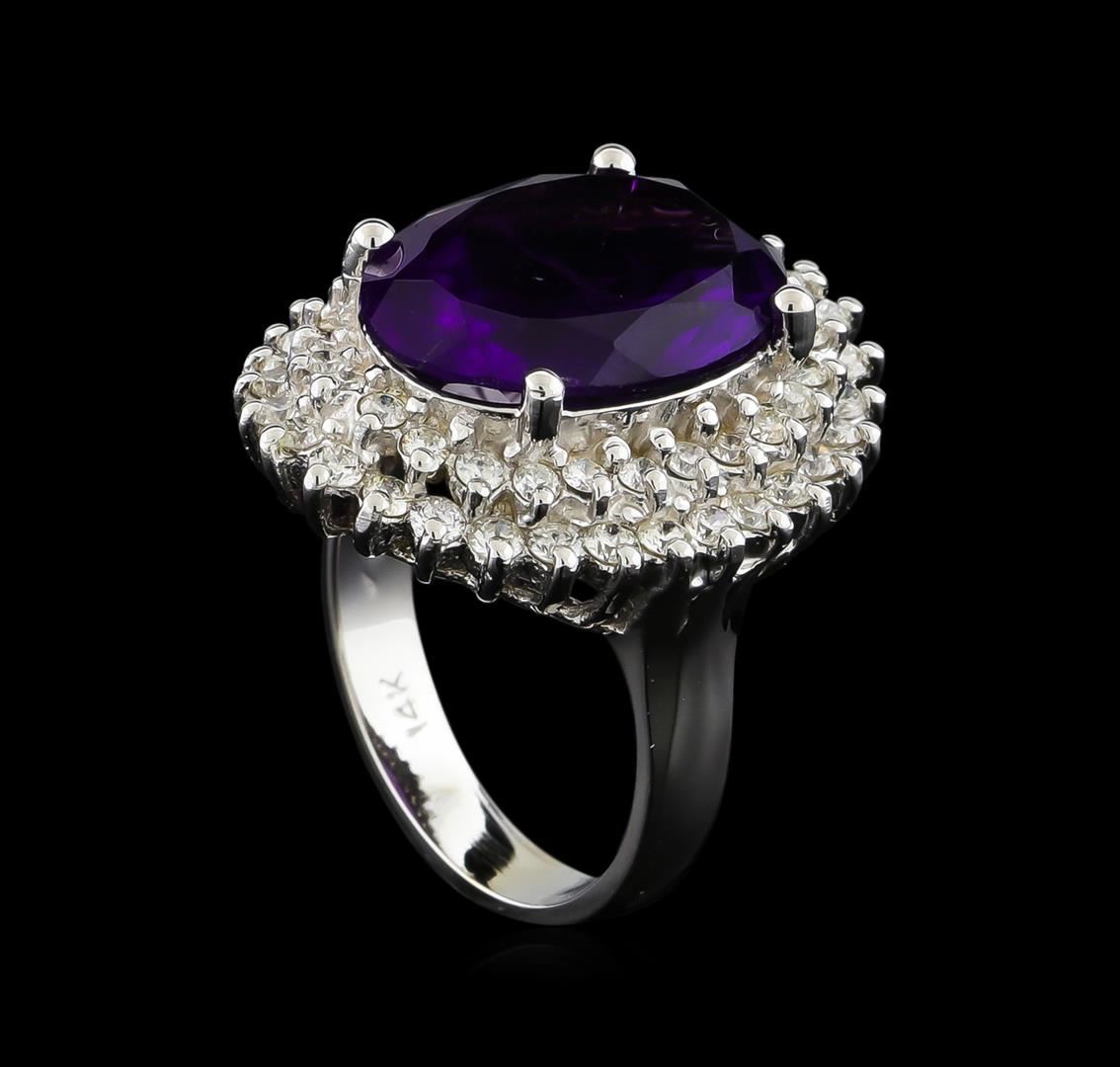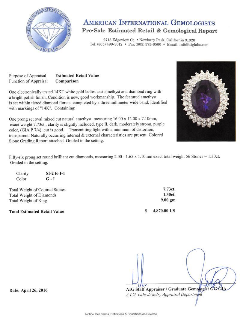 One electronically tested 14KT white gold ladies cast amethyst and diamond ring with a bright polish finish. The featured amethyst is set within tiered diamond florets, completed by a three millimeter wide band. Identified with markings of "14K". Condition is new, good workmanship. Containing: One prong set oval mixed cut natural amethyst, measuring 16.00 x 12.00 x 7.10mm, exact weight 7.73ct., clarity is slightly included, type II, dark, moderately strong, purple color, (GIA P 7/4), cut is good. Transmitting light with a minimum of distortion, transparent. Naturally occurring internal & external characteristics are present. Colored Stone Grading Report attached. Graded in the setting. Fifty-Six prong set round brilliant cut diamonds, measuring 2.00 - 1.65 x 1.10mm exact total weight 56 Stones = 1.30ct. Graded in the setting. Clarity: SI-2 to I-1. Color: G - I. Total Weight of Colored Stones 7.73ct. Total Weight of Diamonds 1.30ct. Total Weight of Ring 9.00gm. AIG Appraised at $4,870.00.