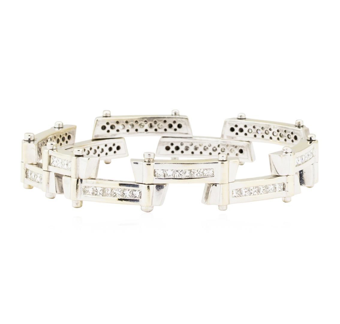 One electronically tested 18KT white gold man's combination cast & assembled fashion staggered bar bracelet with a screw clasp with a bright polish finish. The featured man's bracelet measures approximately nine inches in length. Condition is like new, good workmanship. Containing: Eight channel set princess cut diamonds, measuring 2.80 x 2.70 x 2.03mm (depth est.) approximate total weight of 8 Stones = 1.00ct. Graded in the setting. Color H - I Clarity VS-2 to SI-1 Cut Very Good Sixty channel set princess cut diamonds, measuring 2.70 x 2.60 x 1.95mm (depth est.) approximate total weight of 60 Stones = 6.75ct. Graded in the setting. Color H - I Clarity VS-2 to SI-1 Cut Very Good. Total Weight of Diamonds 7.75ct.. Total Weight of Staggered Bar Bracelet 83.80gm GAS Appraised at $33725.00. GAS Appraised.