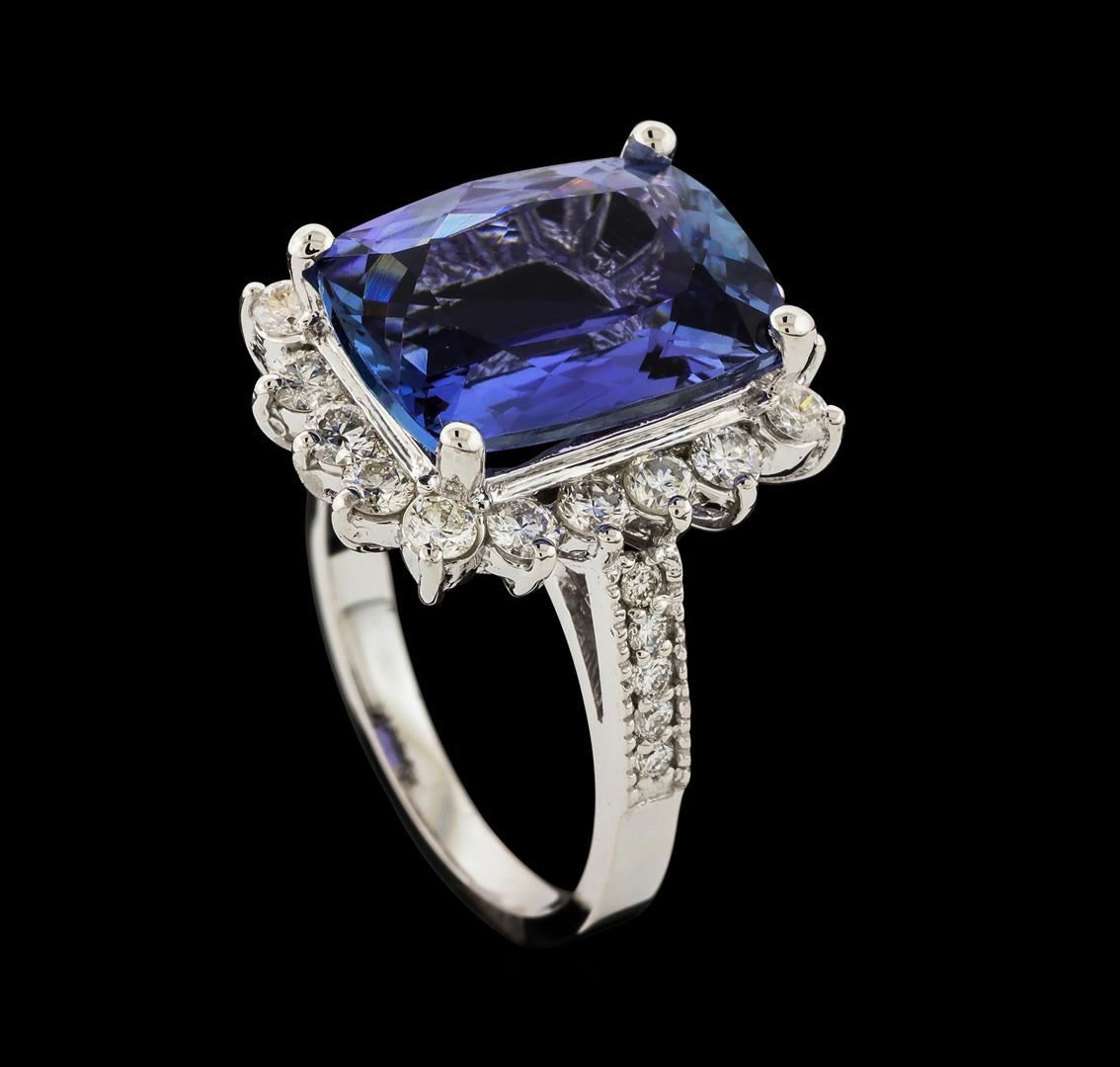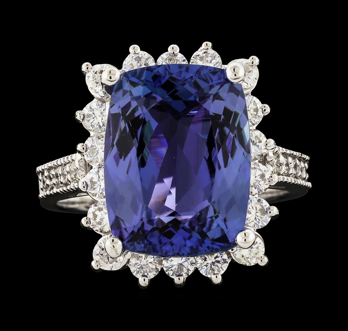 One electronically tested 14KT white gold lady's cast fashion ring with a cathedral shank with a basket halo with a bright polish with milgrain detailing finish. The featured lady's ring has a shank measuring 2.10 millimeters wide. Identified with markings of 'K14'. Condition is new, good workmanship. Containing: One prong set rectangular cushion modified brilliant cut natural tanzanite, measuring 13.98 x 10.62 x 6.00mm, (depth est.) 10%. bulge factor, approximate weight of 7.75ct., clarity is eye clean, medium, moderately strong, bluish violet color, (GIA bV 5/4), cut is very good. Transmitting light with no distortion, transparent. Colored gemstones are presumed to have been subjected to commonly used enhancement processes. Graded in the setting. Eighteen prong set round brilliant cut diamonds, measuring 2.40 - 2.30 x 1.46mm (depth est.) approximate total weight of 18 Stones = 0.88ct. Graded in the setting. Clarity SI-1 to SI-2. Color: H - I Cut Good Ten prong set round brilliant cut diamonds, measuring 1.60 - 1.55 x 0.98mm (depth est.) approximate total weight of 10 Stones = 0.15ct. Graded in the setting. Clarity SI-1 to SI-2. Color: H - I Cut Good. Total Weight of Colored Stones 7.75ct.. Total Weight of Diamonds 1.03ct.. Total Weight of Ring 7.50gm. GAS Appraised at $12,830.00.