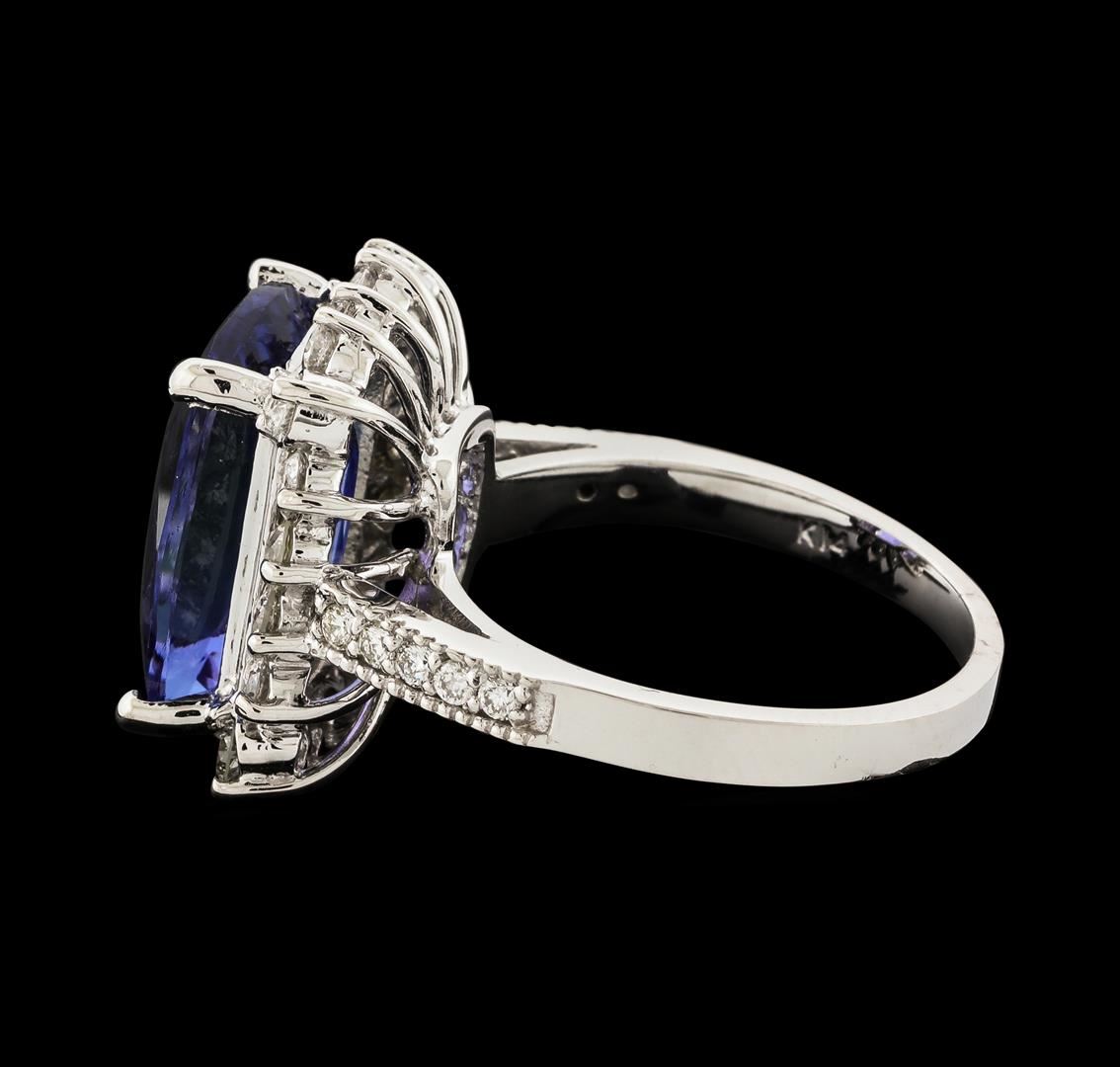 One electronically tested 14KT white gold lady's cast fashion ring with a cathedral shank with a basket halo with a bright polish with milgrain detailing finish. The featured lady's ring has a shank measuring 2.10 millimeters wide. Identified with markings of 'K14'. Condition is new, good workmanship. Containing: One prong set rectangular cushion modified brilliant cut natural tanzanite, measuring 13.98 x 10.62 x 6.00mm, (depth est.) 10%. bulge factor, approximate weight of 7.75ct., clarity is eye clean, medium, moderately strong, bluish violet color, (GIA bV 5/4), cut is very good. Transmitting light with no distortion, transparent. Colored gemstones are presumed to have been subjected to commonly used enhancement processes. Graded in the setting. Eighteen prong set round brilliant cut diamonds, measuring 2.40 - 2.30 x 1.46mm (depth est.) approximate total weight of 18 Stones = 0.88ct. Graded in the setting. Clarity SI-1 to SI-2. Color: H - I Cut Good Ten prong set round brilliant cut diamonds, measuring 1.60 - 1.55 x 0.98mm (depth est.) approximate total weight of 10 Stones = 0.15ct. Graded in the setting. Clarity SI-1 to SI-2. Color: H - I Cut Good. Total Weight of Colored Stones 7.75ct.. Total Weight of Diamonds 1.03ct.. Total Weight of Ring 7.50gm. GAS Appraised at $12,830.00.