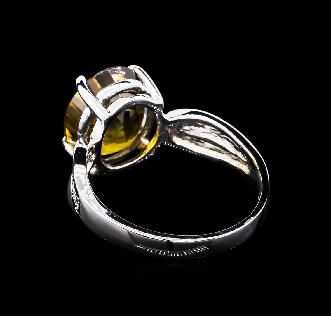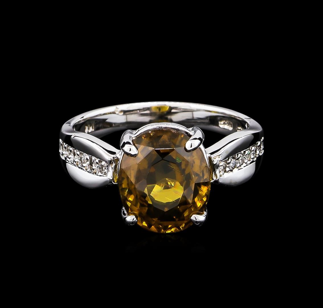 One polished, stamped, and tested 14KT white gold ring mounted with: 1 genuine zircon center stone weighing 7.75ct, and 12 genuine round diamonds weighing 0.12ct. This item weighs 5.40 grams, condition is new, excellent workmanship. MAIN GEMSTONE: Species: Zircon. Shape: Oval. Cutting Style: Brilliant cut crown; step cut pavilion. Measurements: 11.1 x 9.3 x 6.8mm. Weight: 7.75ct. Color: Orangy brown. Cut Grade: Very good. Refractive Index: OTL DR. Hardness: 6.5. ADJACENT GEMSTONES ON RING: Identity: Natural Diamond. Shape: Round. Cutting Style: Brilliant cut. Quantity: 12 diamonds. Measurements: 1.4mm. Total Weight: 0.12ct. Clarity Grade: SI2 - I1. Color Grade: H - I. Refractive Index: 2.418. Hardness: 10. AIGL Appraised at $4,250.00.