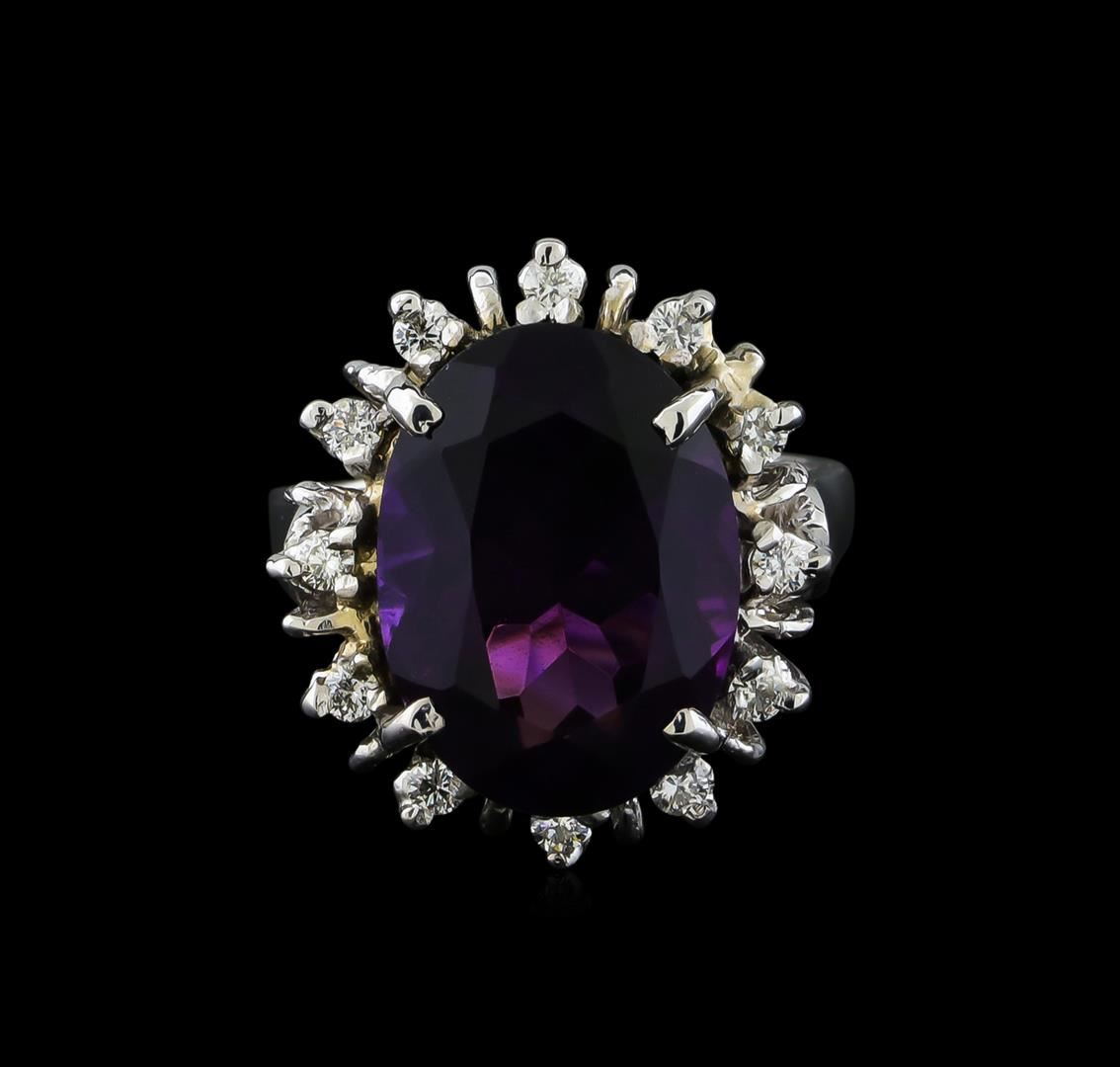One Ring featuring: 14KT White Gold weighing 6.85 grams containing one Amethyst center stone with a total weight of 7.77ct and Diamonds with a total weight of 0.35ct.