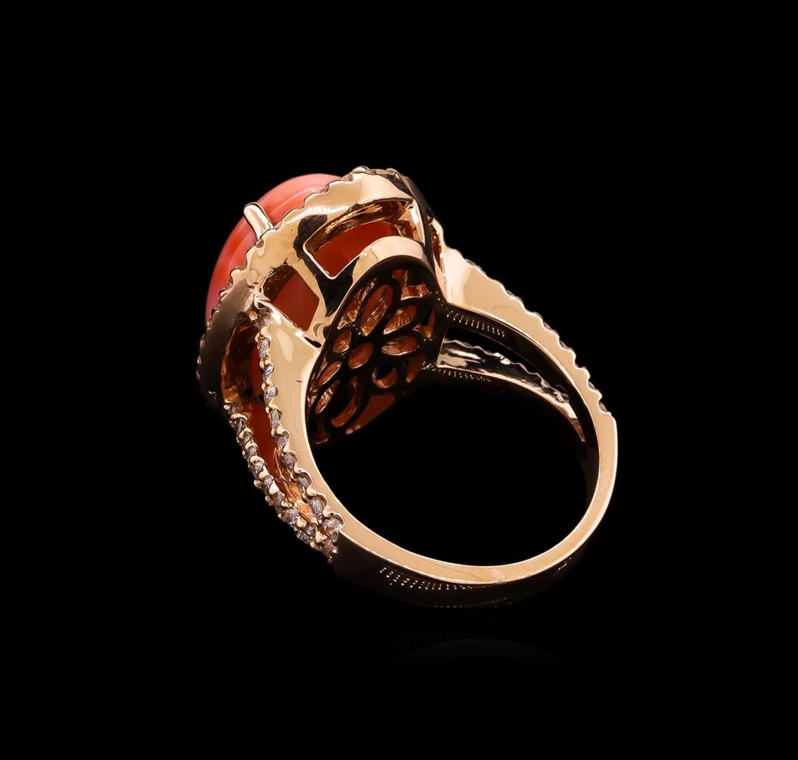 One ring featuring: 14KT rose gold weighing 7.13 grams containing one coral with a total weight of 7.78ct and diamonds with a total weight of 0.75ct.