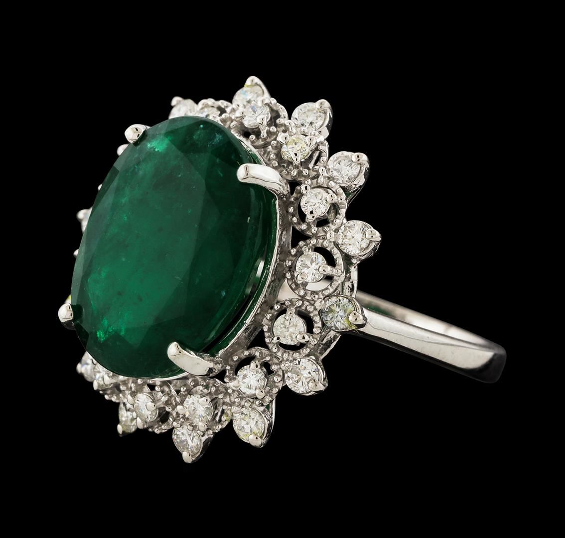 One electronically tested 14KT white gold lady's cast fashion ring with a staggered double basket halo with a bright polish with milgrain detailing finish. The featured lady's ring has a shank measuring 2.33 millimeters wide. Identified with markings of 'K14'. Condition is new, good workmanship. Containing: One prong set oval modified mixed cut natural emerald, measuring 14.63 x 11.06 x 7.51mm, (depth est.) 12%. bulge factor, approximate weight of 7.78ct., clarity is heavily included, medium dark, moderately strong, green color, (GIA G 6/4), cut is good. Transmitting light somewhat diffusely, semi-transparent to translucent. Naturally occurring internal & external characteristics are present. Indications of oil residue. Colored gemstones are presumed to have been subjected to commonly used enhancement processes. Graded in the setting. Fourteen prong set round brilliant cut diamonds, measuring 1.90 - 1.85 x 1.17mm (depth est.) approximate total weight of 14 Stones = 0.35ct. Graded in the setting. Clarity SI-1 to SI-2. Color: G - H Cut Good Fourteen prong set round brilliant cut diamonds, measuring 1.70 - 1.60 x 1.02mm (depth est.) approximate total weight of 14 Stones = 0.24ct. Graded in the setting. Clarity SI-1 to SI-2. Color: G - H Cut Good. Total Weight of Colored Stones 7.78ct.. Total Weight of Diamonds 0.59ct.. Total Weight of Ring 6.20gm. GAS Appraised at $9,025.00.