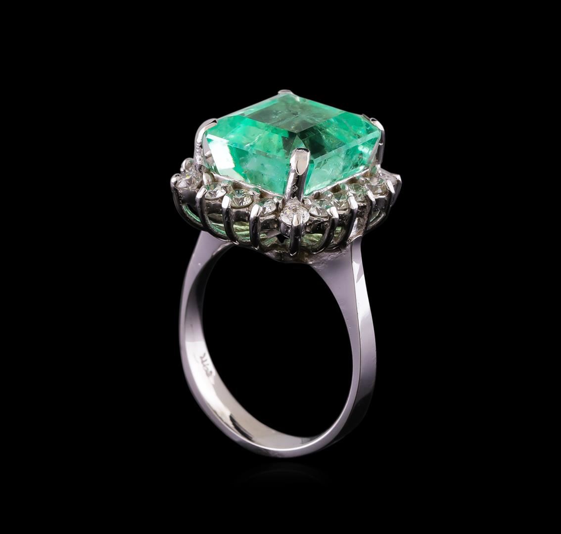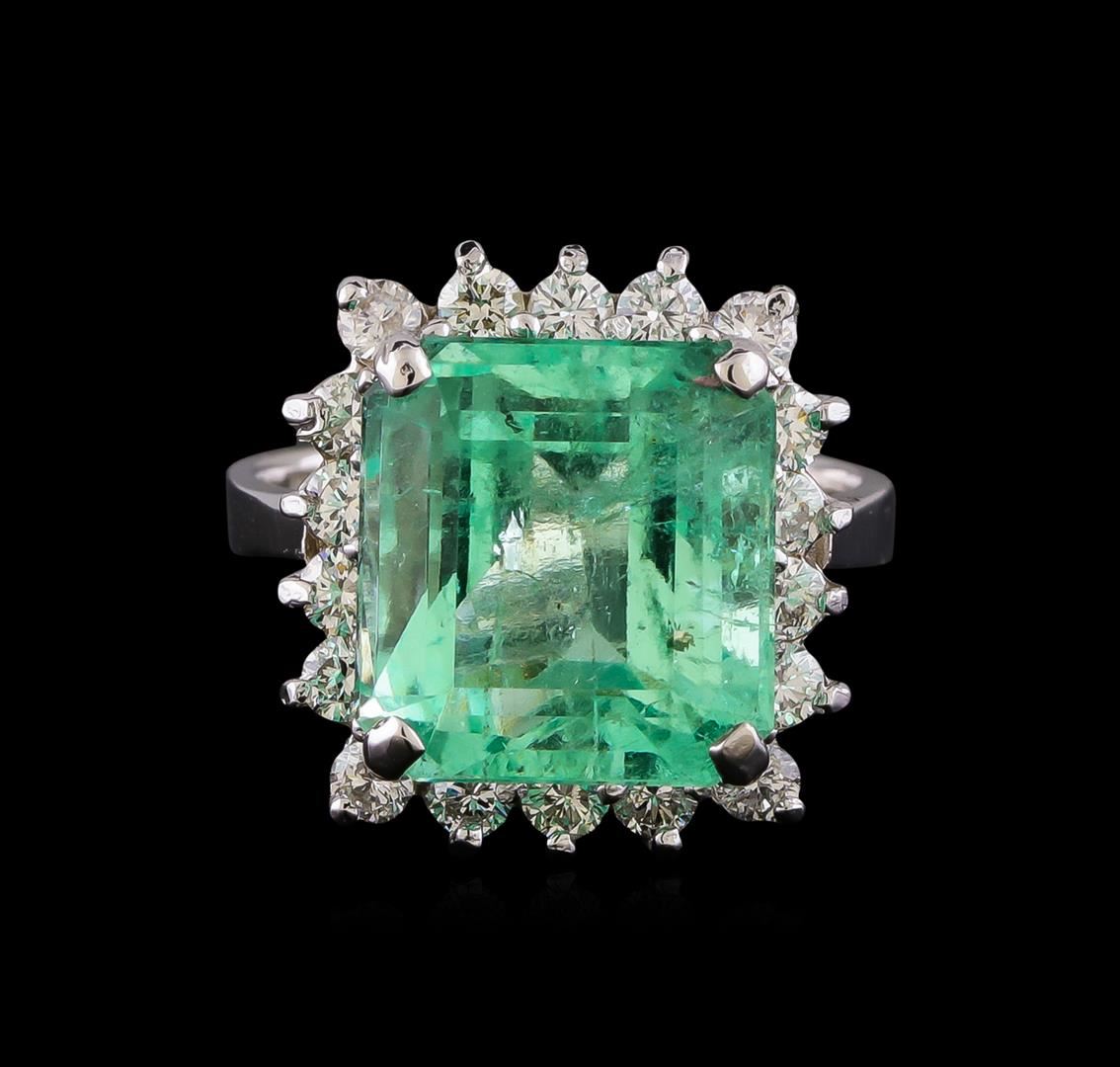 One electronically tested 14KT white gold lady's cast fashion ring with a basket halo with a bright polish finish. The featured lady's ring has a shank measuring 3.25 millimeters wide. Identified with markings of "14K". Condition is new, good workmanship. Containing: One prong set emerald step cut natural emerald, measuring 11.57 x 10.87 x 8.48mm, (depth est.) approximate weight of 7.80ct., clarity is moderately included, medium light, moderately strong, green color, (GIA G 4/4), cut is very good. Transmitting light with a minimum of distortion, transparent. Indications of oil residue. Naturally occurring internal & external characteristics are present. Colored gemstones are presumed to have been subjected to commonly used enhancement processes. Graded in the setting. Eighteen prong set round brilliant cut diamonds, measuring 2.35 - 2.25 x 1.43mm (depth est.) approximate total weight of 18 Stones = 0.83ct. Graded in the setting. Clarity: VS-2 to SI-2. Color: G - Good. Total Weight of Colored Stones 7.80ct. Total Weight of Diamonds 0.83ct. Total Weight of Ring 6.90gm. GAS Appraised at $17,435.00.