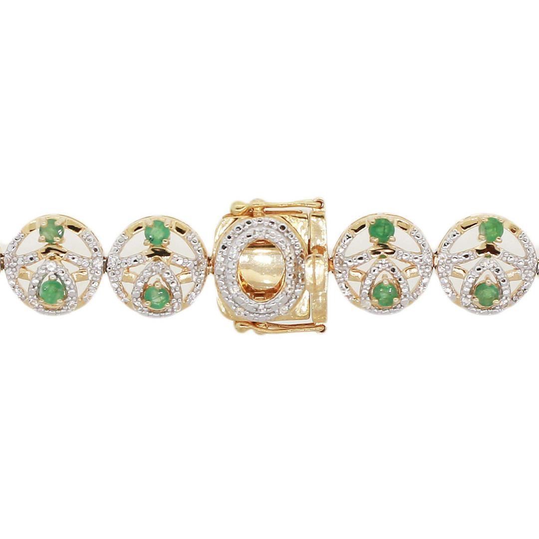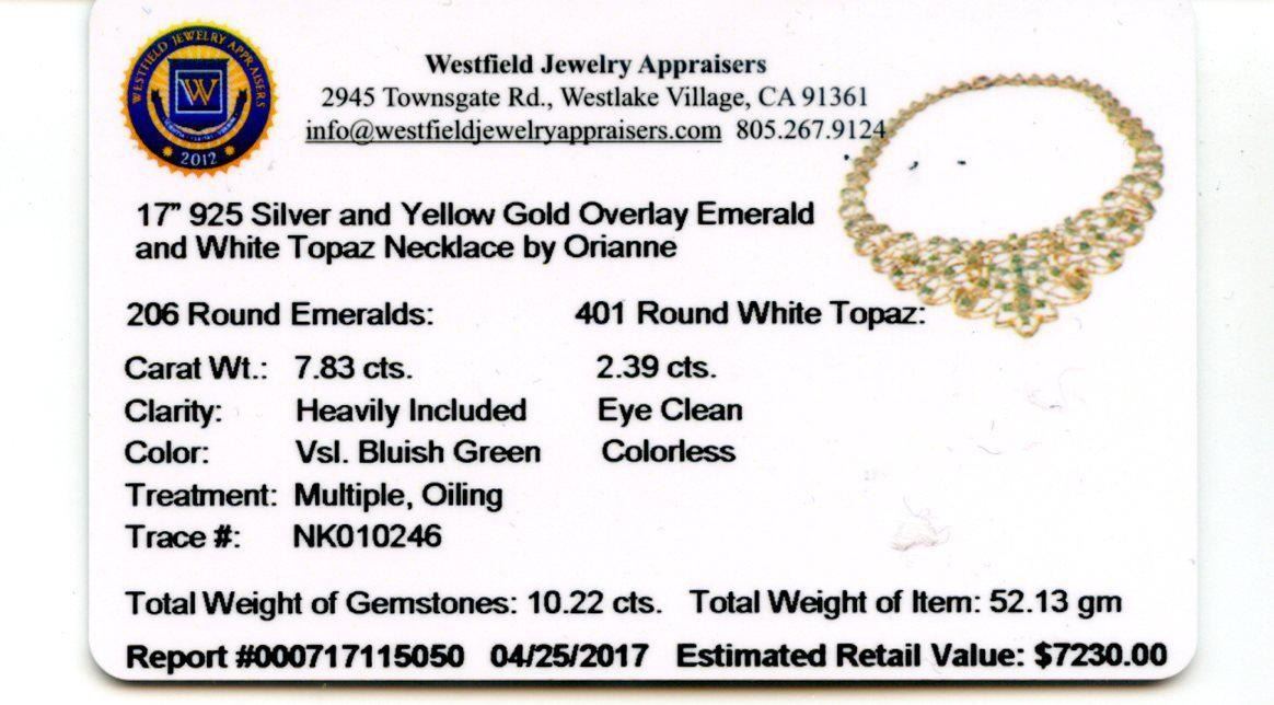 One electronically tested 925 silver ladies cast and assembled emerald and white topaz necklace. Seventeen inch length necklace features a rigid cascading emerald and white topaz floral design supported by a flexible emerald and white topaz link ribbon, t