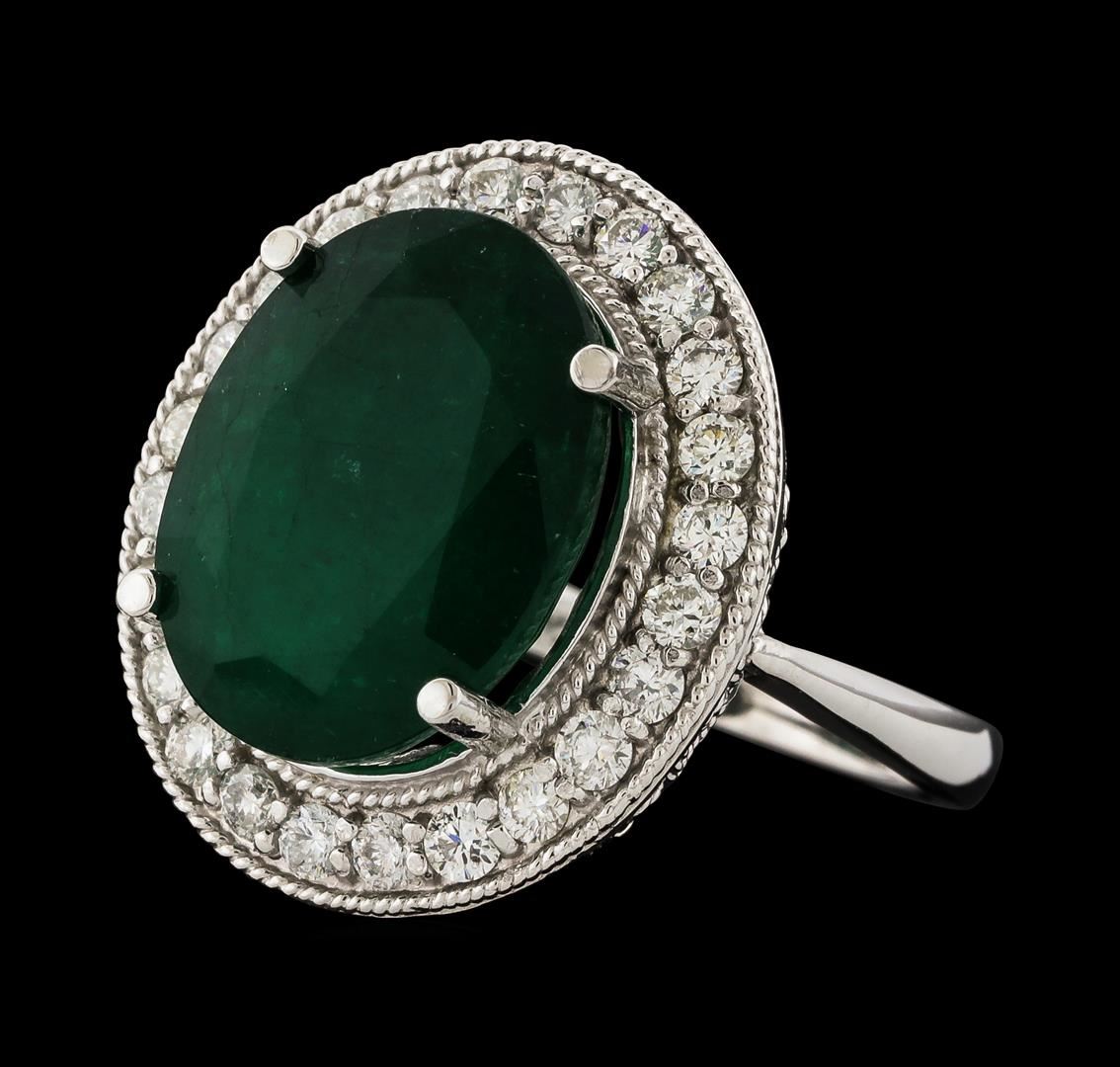 One electronically tested 14KT white gold lady's cast fashion ring with a basket halo with cathedral shank with a bright polish with milgrain detailing finish. The featured lady's ring has a shank measuring 2.10 millimeters wide. Identified with markings of 'K14'. Condition is new, good workmanship. Containing: One prong set oval modified mixed cut natural emerald, measuring 15.04 x 11.30 x 6.76mm, (depth est.) 15%. bulge factor, approximate weight of 7.83ct., clarity is heavily included, medium dark, moderately strong, green color, (GIA G 6/4), cut is good. Transmitting light somewhat diffusely, semi-transparent to translucent. Naturally occurring internal & external characteristics are present. Indications of oil residue. Colored gemstones are presumed to have been subjected to commonly used enhancement processes. Graded in the setting. Twenty-Four prong set round brilliant cut diamonds, measuring 2.10 - 2.05 x 1.29mm (depth est.) approximate total weight of 24 Stones = 0.83ct. Graded in the setting. Clarity SI-1 to SI-2. Color: G - H Cut Good. Total Weight of Colored Stones 7.83ct.. Total Weight of Diamonds 0.83ct.. Total Weight of Ring 8.10gm. GAS Appraised at $9,715.00.