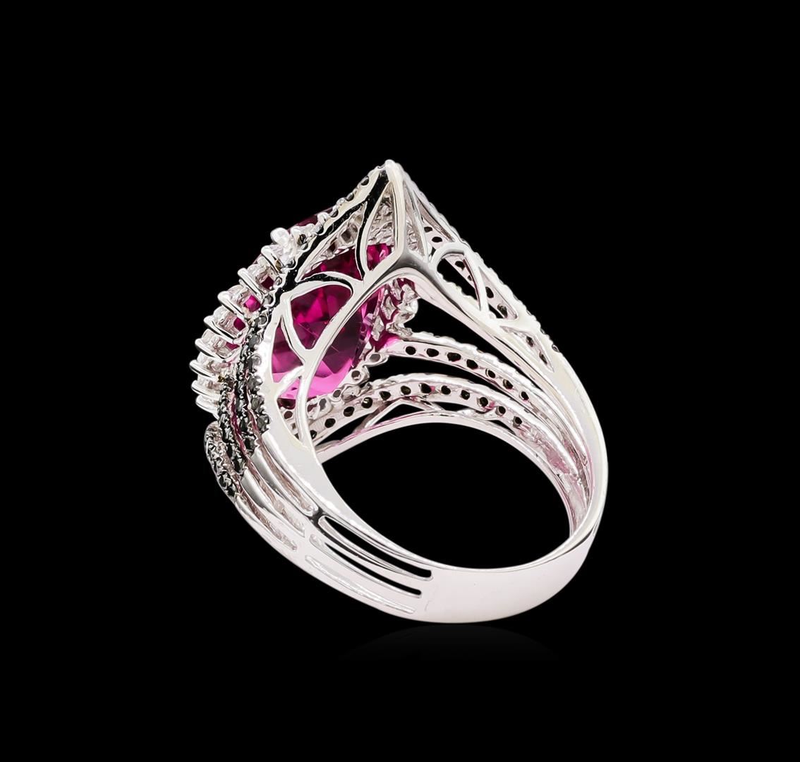 One electronically tested 18KT white gold lady's cast fashion halo ring with a bright polish finish. The featured ladies' ring has a shank measuring 4.35 millimeters in width. Identified with markings of "18K 750". Condition is new, good workmanship. Containing: One prong set oval modified brilliant cut natural rubellite, measuring 14.90 x 11.70 x 7.00mm, approximate weight of 7.84ct., clarity is slightly included, type III, medium dark, moderately strong, orangy red color, (GIA oR 6/4), cut is very good. Colored gemstones are presumed to have been subjected to commonly used enhancement processes. Transmitting light with a minimum of distortion, transparent. Graded in the setting. Thirty-Two prong set rose cut diamonds, measuring 1.60 - 1.50 x 0.96mm (depth est.) approximate total weight of 32 Stones = 0.31ct. Graded in the setting. Clarity: VS-1 to VS-2. Color: G - Good Eighty-Six prong set round brilliant cut diamonds, measuring 1.15 - 1.10 x 0.68mm (depth est.) approximate total weight of 86 Stones = 0.47ct. Colored gemstones are presumed to have been subjected to commonly used enhancement processes. Graded in the setting. Cut Good. Total Weight of Colored Stones 7.84ct. Total Weight of Diamonds 0.31ct. Total Weight of Ring 6.70gm. GAS Appraised at $12,125.00.