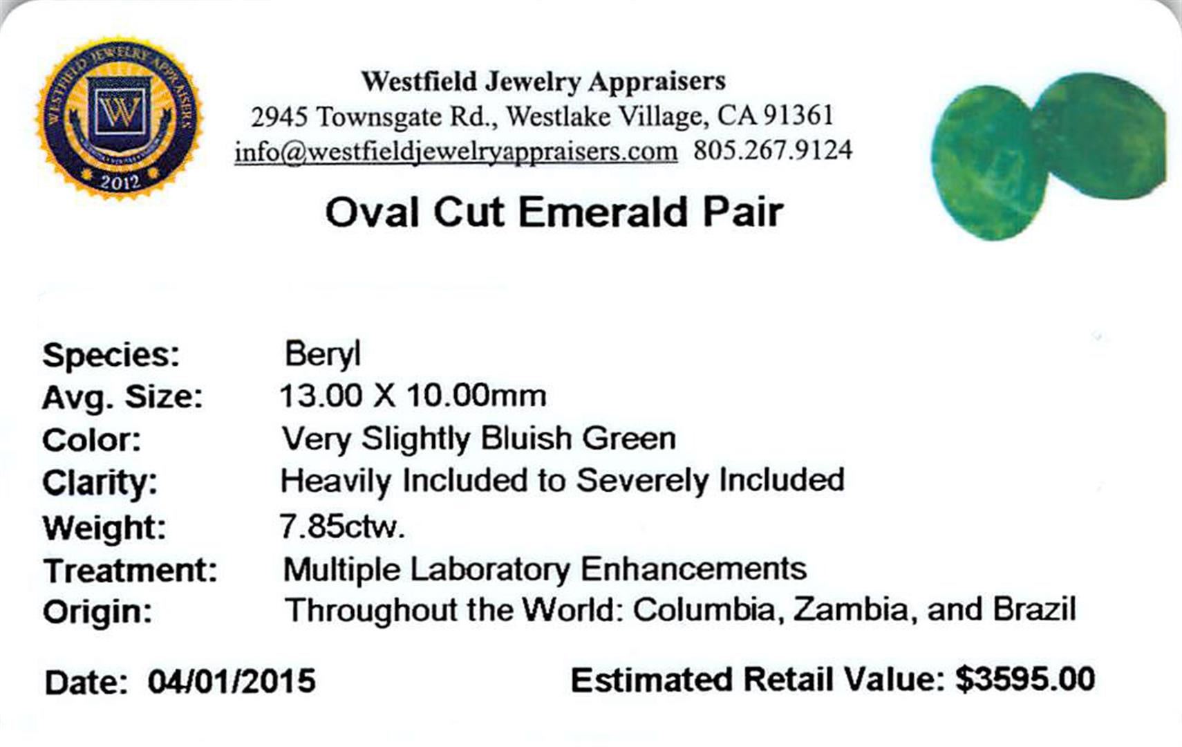 Two oval mixed cut natural emeralds exact total weight 7.85ct., clarity is heavily included, type III, medium dark, very slightly grayish, very slightly bluish green color, (GIA vslbG 6/3), cut is good. Westfield Appraised at $3,595.00.