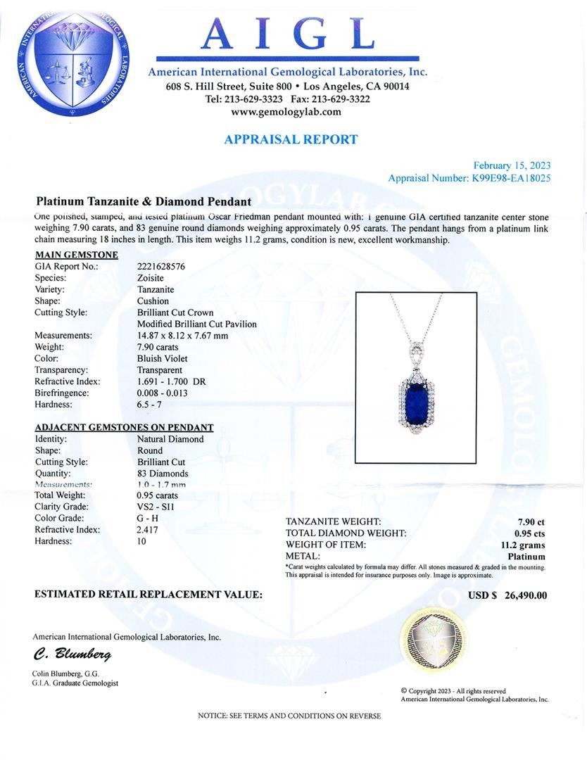 7.90ct Tanzanite and 0.95ctw Diamond Platinum Pendant (GIA CERTIFIED). One polished, stamped, and tested platinum Oscar Friedman pendant mounted with: 1 genuine GIA certified tanzanite center stone weighing 7.90 carats, and 83 genuine round diamonds weighing approximately 0.95 carats. The pendant hangs from a platinum link chain measuring 18 inches in length. This item weighs 11.2 grams, condition is new, excellent workmanship. MAIN GEMSTONE GIA Report No.: 2221628576 Species: Zoisite Variety: Tanzanite Shape: Cushion Cutting Style: Brilliant Cut Crown Modified Brilliant Cut Pavilion Measurements: 14.87 x 8.12 x 7.67mm Weight: 7.90 carats Color: Bluish Violet Transparency: Transparent Refractive Index: 1.691 - 1.700 DR Birefringence: 0.008 - 0.013 Hardness: 6.5 - 7 ADJACENT GEMSTONES ON PENDANT Identity: Natural Diamond Shape: Round Cutting Style: Brilliant Cut Quantity: 83 Diamonds Measurements: 1.0 - 1.7mm Total Weight: 0.95 carats Clarity Grade: VS2 - SI1 Color Grade: G - H Refractive Index: 2.417 Hardness: 10 TANZANITE WEIGHT: 7.90 ct TOTAL DIAMOND WEIGHT: 0.95 cts WEIGHT OF ITEM: 11.2 grams METAL: Platinum