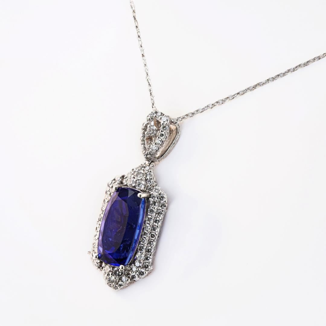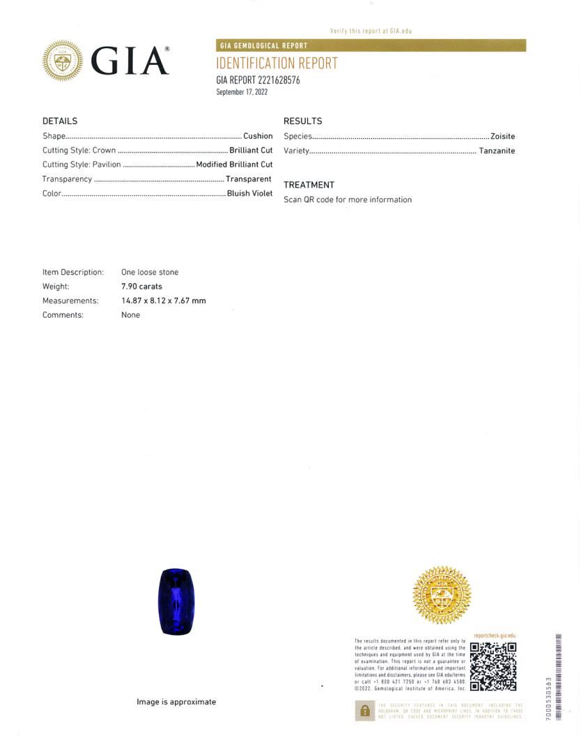 One polished, stamped, and tested platinum Oscar Friedman pendant mounted with: 1 genuine GIA certified tanzanite center stone weighing 7.90 carats, and 83 genuine round diamonds weighing approximately 0.95 carats. The pendant hangs from a platinum link chain measuring 18 inches in length. This item weighs 11.2 grams, condition is new, excellent workmanship. #MAIN GEMSTONE# GIA Report No.: 2221628576; Species: Zoisite; Variety: Tanzanite; Shape: Cushion; Cutting Style: Brilliant Cut Crown Modified Brilliant Cut Pavilion; Measurements: 14.87 x 8.12 x 7.67mm; Weight: 7.90 carats; Color: Bluish Violet; Transparency: Transparent; Refractive Index: 1.691 - 1.700 DR; Birefringence: 0.008 - 0.013; Hardness: 6.5 - 7 #ADJACENT GEMSTONES ON PENDANT# Identity: Natural Diamond; Shape: Round; Cutting Style: Brilliant Cut; Quantity: 83 Diamonds; Measurements: 1.0 - 1.7mm; Total Weight: 0.95 carats; Clarity Grade: VS2 - SI1; Color Grade: G - H; Refractive Index: 2.417; Hardness: 10; TANZANITE WEIGHT: 7.90 ct; TOTAL DIAMOND WEIGHT: 0.95 cts; WEIGHT OF ITEM: 11.2 grams; METAL: Platinum