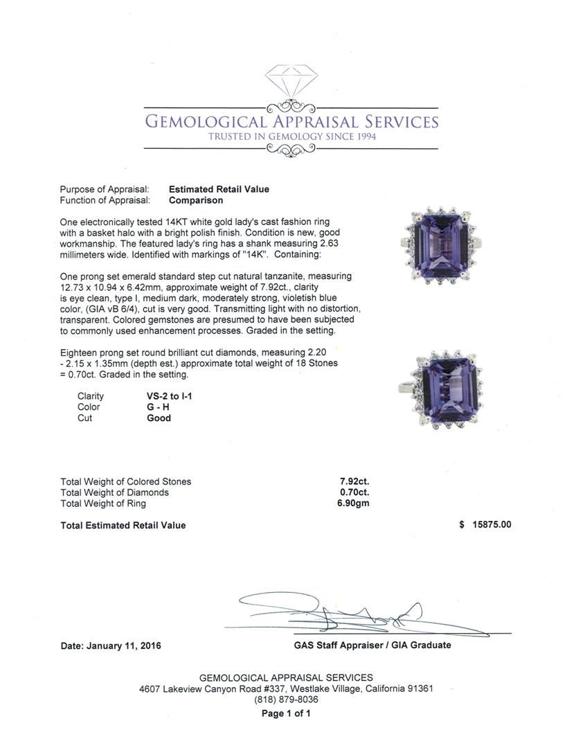 One electronically tested 14KT white gold lady's cast fashion ring with a basket halo with a bright polish finish. The featured lady's ring has a shank measuring 2.63 millimeters wide. Identified with markings of "14K". Condition is new, good workmanship. Containing: One prong set emerald standard step cut natural tanzanite, measuring 12.73 x 10.94 x 6.42mm, approximate weight of 7.92ct., clarity is eye clean, type I, medium dark, moderately strong, violetish blue color, (GIA vB 6/4), cut is very good. Transmitting light with no distortion, transparent. Colored gemstones are presumed to have been subjected to commonly used enhancement processes. Graded in the setting. Eighteen prong set round brilliant cut diamonds, measuring 2.20 - 2.15 x 1.35mm (depth est.) approximate total weight of 18 Stones = 0.70ct. Graded in the setting. Clarity: VS-2 to I-1. Color: G - Good. Total Weight of Colored Stones 7.92ct. Total Weight of Diamonds 0.70ct. Total Weight of Ring 6.90gm. GAS Appraised at $15,875.00.