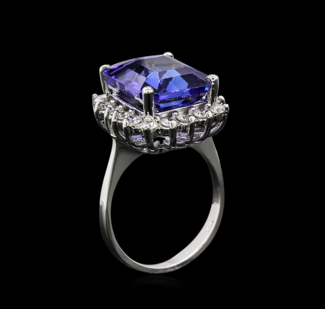 One electronically tested 14KT white gold lady's cast fashion ring with a basket halo with a bright polish finish. The featured lady's ring has a shank measuring 2.63 millimeters wide. Identified with markings of "14K". Condition is new, good workmanship. Containing: One prong set emerald standard step cut natural tanzanite, measuring 12.73 x 10.94 x 6.42mm, approximate weight of 7.92ct., clarity is eye clean, type I, medium dark, moderately strong, violetish blue color, (GIA vB 6/4), cut is very good. Transmitting light with no distortion, transparent. Colored gemstones are presumed to have been subjected to commonly used enhancement processes. Graded in the setting. Eighteen prong set round brilliant cut diamonds, measuring 2.20 - 2.15 x 1.35mm (depth est.) approximate total weight of 18 Stones = 0.70ct. Graded in the setting. Clarity: VS-2 to I-1. Color: G - Good. Total Weight of Colored Stones 7.92ct. Total Weight of Diamonds 0.70ct. Total Weight of Ring 6.90gm. GAS Appraised at $15,875.00.