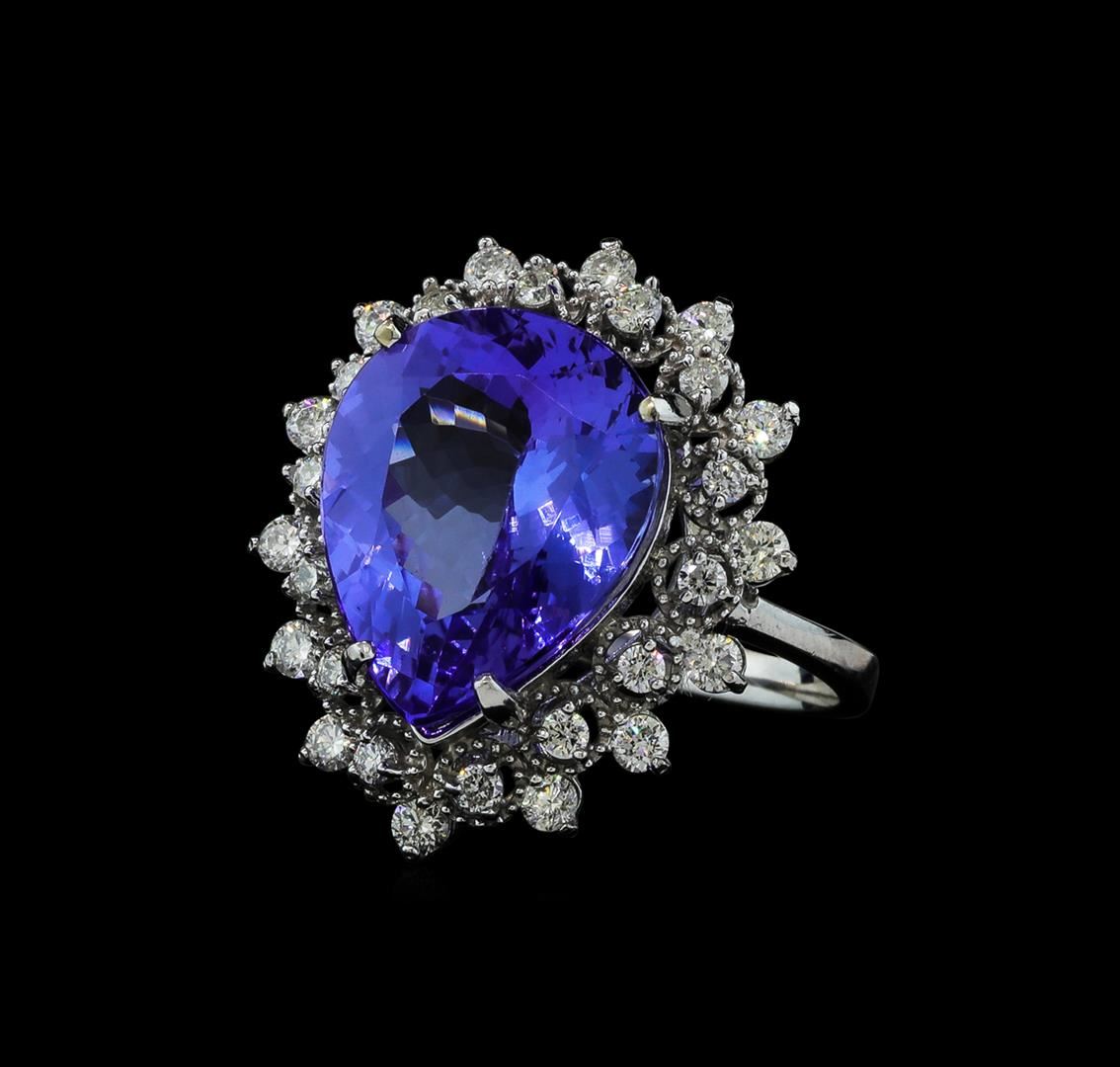 One electronically tested 14KT white gold lady's cast fashion ring with a double basket halo with a bright polish with milgrain detailing finish. The featured lady's ring has a shank measuring 2.12 millimeters wide. Identified with markings of 'K14'. Condition is new, good workmanship. Containing: One prong set pear modified brilliant cut natural tanzanite, measuring 15.01 x 12.17 x 6.76mm, (depth est.) approximate weight of 7.95ct., clarity is eye clean, medium light, moderately strong, violetish blue color, (GIA vB 4/4), cut is very good. Transmitting light with no distortion, transparent. Colored gemstones are presumed to have been subjected to commonly used enhancement processes. Graded in the setting. Fourteen prong set round brilliant cut diamonds, measuring 2.10 - 2.00 x 1.27mm (depth est.) approximate total weight of 14 Stones = 0.46ct. Graded in the setting. Clarity SI-1 to I-1. Color: H - I Cut Good Fourteen prong set round brilliant cut diamonds, measuring 1.80 - 1.70 x 1.07mm (depth est.) approximate total weight of 14 Stones = 0.28ct. Graded in the setting. Clarity SI-1 to I-1. Color: H - I Cut Good. Total Weight of Colored Stones 7.95ct.. Total Weight of Diamonds 0.74ct.. Total Weight of Ring 6.10gm GAS Appraised at $13,015.00.