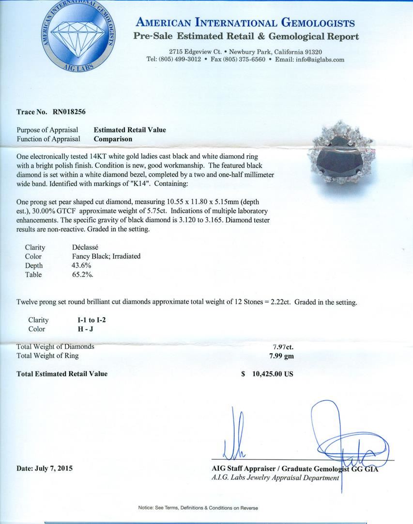 One electronically tested 14KT white gold ladies cast black and white diamond ring with a bright polish finish. The featured black diamond is set within a white diamond bezel, completed by a two and one-half millimeter wide band. Identified with markings of "K14". Condition is new, good workmanship. Containing: One prong set pear shaped cut diamond, measuring 10.55 x 11.80 x 5.15mm (depth est.), 30.00.%. GTCF approximate weight of 5.75ct. Indications of multiple laboratory enhancements. The specific gravity of black diamond is 3.120 to 3.165. Diamond tester results are non-reactive. Graded in the setting. Clarity Déclassé‚. Color: Fancy Black; Irradiated. Depth: 43.6%. Table: 65.2%. Twelve prong set round brilliant cut diamonds approximate total weight of 12 Stones = 2.22ct. Graded in the setting. Clarity: I-1 to I-2. Color: H - J. Total Weight of Diamonds 7.97ct. Total Weight of Ring 7.99gm. AIG Appraised at $10,425.00.