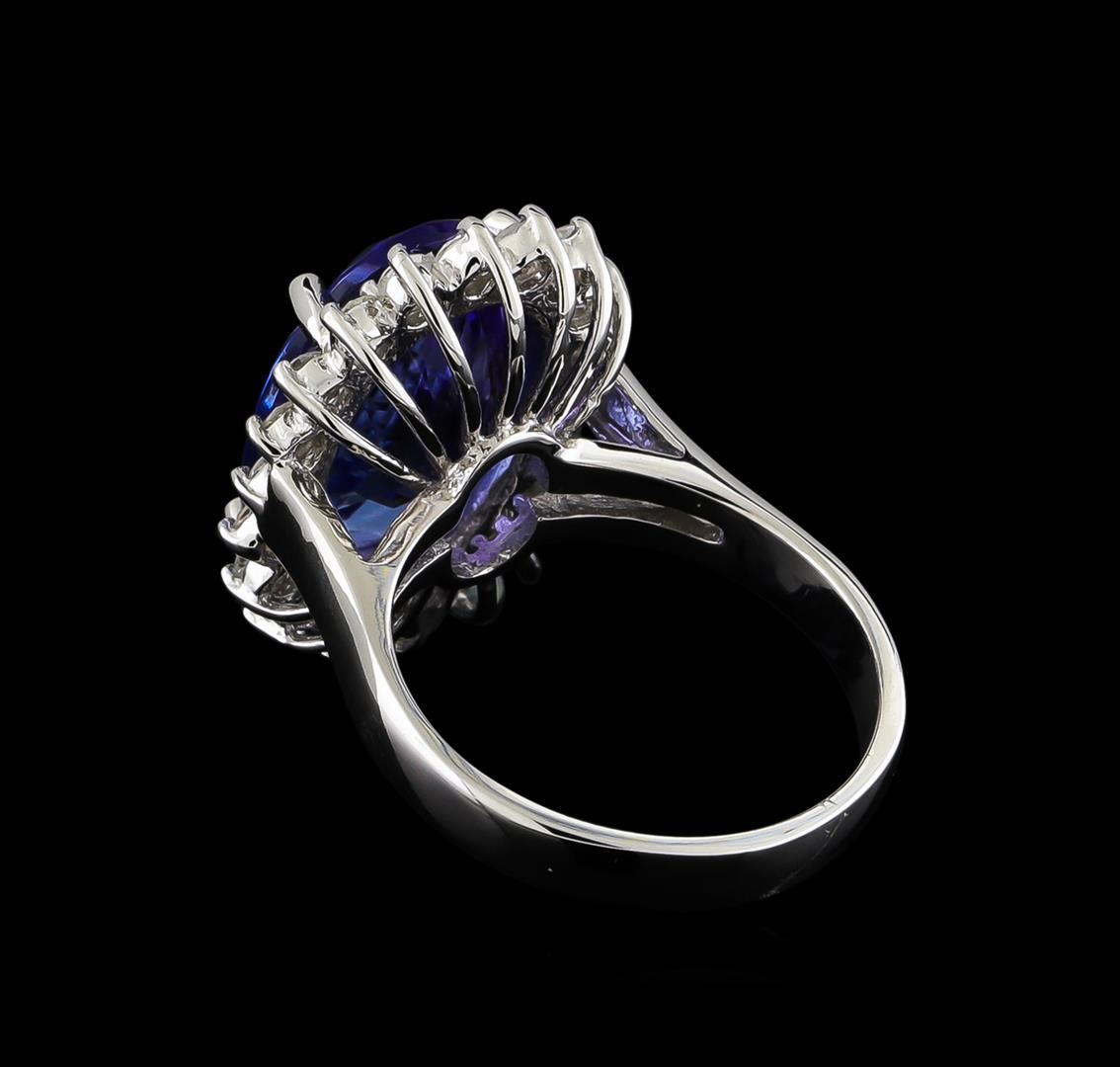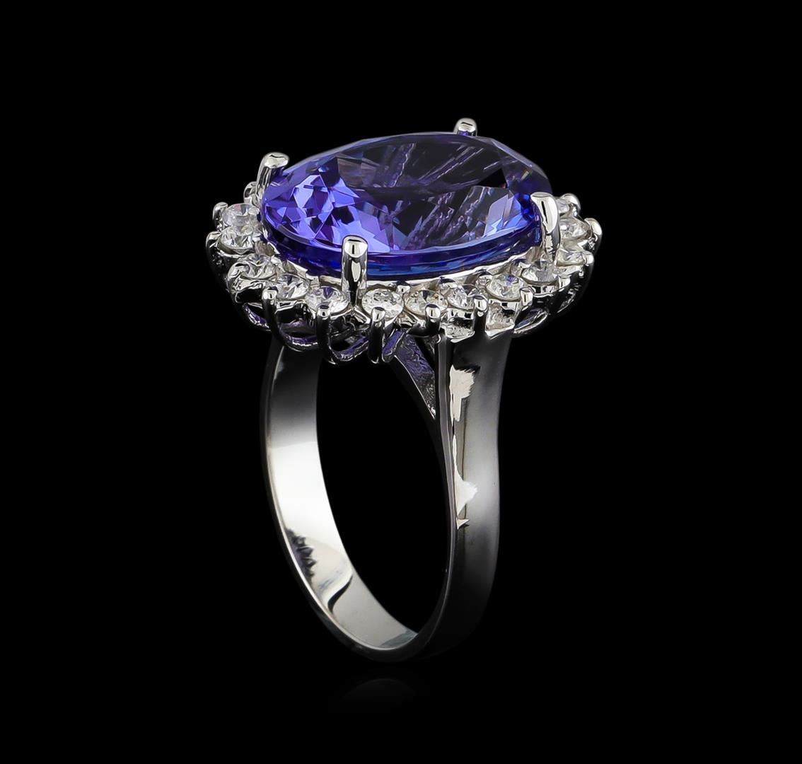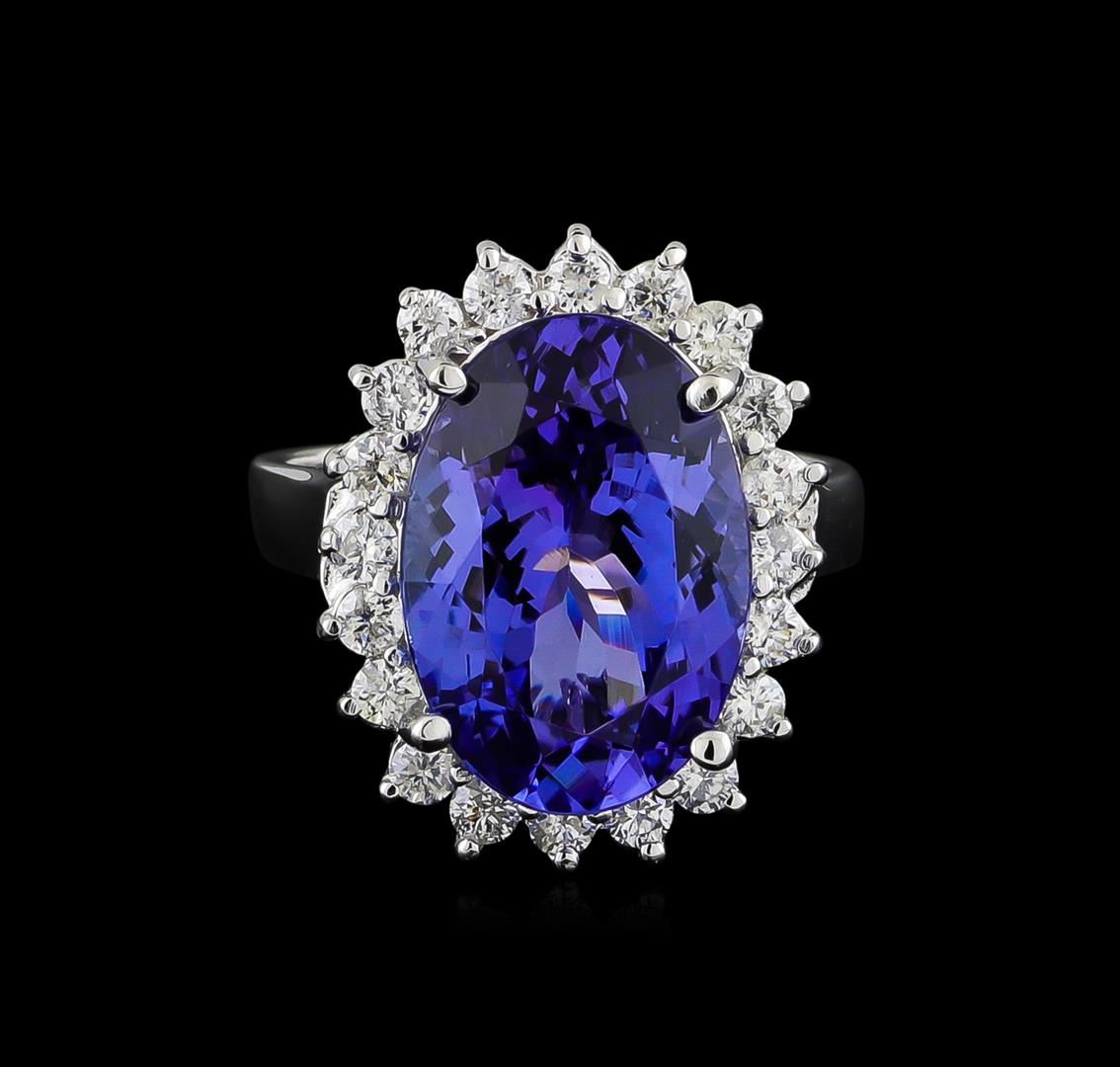 One electronically tested 14KT white gold ladies cast tanzanite and diamond ring with a bright polish finish. The featured tanzanite is set within a diamond floret supported by a ribbed under gallery, completed by a three millimeter wide band. Identified with markings of "14K". Condition is new, good workmanship. Containing: One prong set oval mixed cut natural tanzanite, measuring 14.80 x 10.30 x 7.10mm, 5%. bulge factor, approximate weight of 7.99ct., clarity is eye clean, type I, medium dark, very slightly grayish, bluish violet color, (GIA bV 6/3), cut is good. Transmitting light with no distortion, transparent. Colored Stone Grading Report attached. Graded in the setting. Tanzanite is a very rare gemstone that is only found in the country of Tanzania. Originally discovered in 1967. Tiffany & Company, named the stone Tanzanite. It is found in the Usumburu Mountains that border the Umba Valley of northern Tanzania. Tanzanite occurs in gray, brown, violet, blue, reddish-purple, & green. The gem is interesting because of its exceptional pleochroism. Rotated in different directions a tanzanite will exhibit multiple changes of color. Tanzanite has a low tolerance to ultrasonic cleaning, and should not be cleaned using this method. Twenty prong set round brilliant cut diamonds, measuring 2.00 - 2.00 x 1.20mm (depth est.) approximate. Total Weight of 20 Stones = 0.60ct. Graded in the setting. Clarity: SI-2 to I-2. Color: F - H. Total Weight of Colored Stones 7.99ct. Total Weight of Diamonds 0.60ct. Total Weight of Ring 6.65gm. AIG Appraised at $19,680.00.