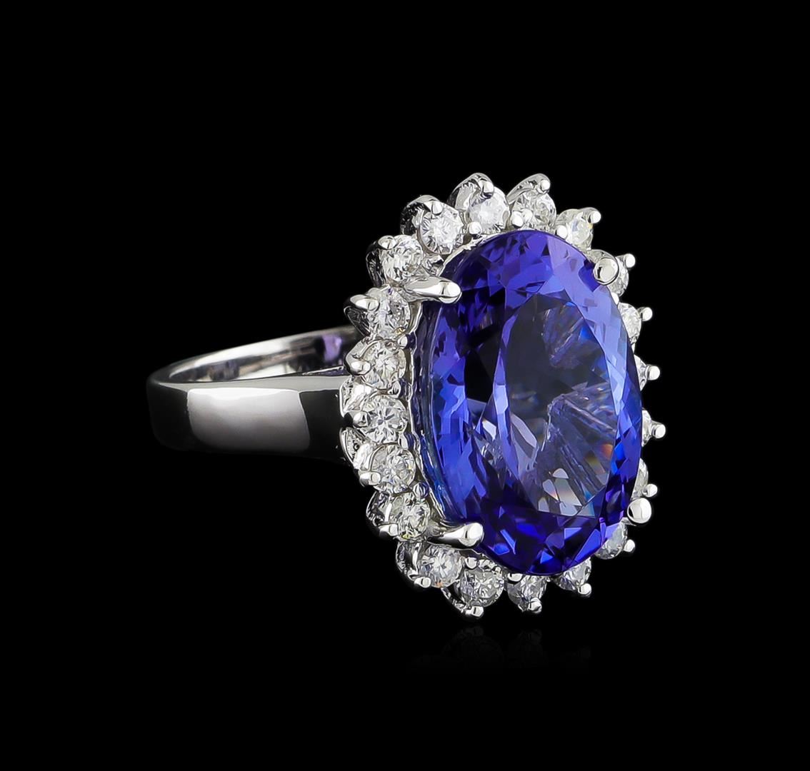 One electronically tested 14KT white gold ladies cast tanzanite and diamond ring with a bright polish finish. The featured tanzanite is set within a diamond floret supported by a ribbed under gallery, completed by a three millimeter wide band. Identified with markings of "14K". Condition is new, good workmanship. Containing: One prong set oval mixed cut natural tanzanite, measuring 14.80 x 10.30 x 7.10mm, 5%. bulge factor, approximate weight of 7.99ct., clarity is eye clean, type I, medium dark, very slightly grayish, bluish violet color, (GIA bV 6/3), cut is good. Transmitting light with no distortion, transparent. Colored Stone Grading Report attached. Graded in the setting. Tanzanite is a very rare gemstone that is only found in the country of Tanzania. Originally discovered in 1967. Tiffany & Company, named the stone Tanzanite. It is found in the Usumburu Mountains that border the Umba Valley of northern Tanzania. Tanzanite occurs in gray, brown, violet, blue, reddish-purple, & green. The gem is interesting because of its exceptional pleochroism. Rotated in different directions a tanzanite will exhibit multiple changes of color. Tanzanite has a low tolerance to ultrasonic cleaning, and should not be cleaned using this method. Twenty prong set round brilliant cut diamonds, measuring 2.00 - 2.00 x 1.20mm (depth est.) approximate. Total Weight of 20 Stones = 0.60ct. Graded in the setting. Clarity: SI-2 to I-2. Color: F - H. Total Weight of Colored Stones 7.99ct. Total Weight of Diamonds 0.60ct. Total Weight of Ring 6.65gm. AIG Appraised at $19,680.00.