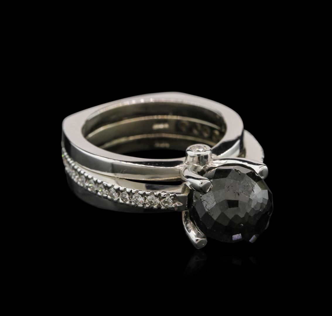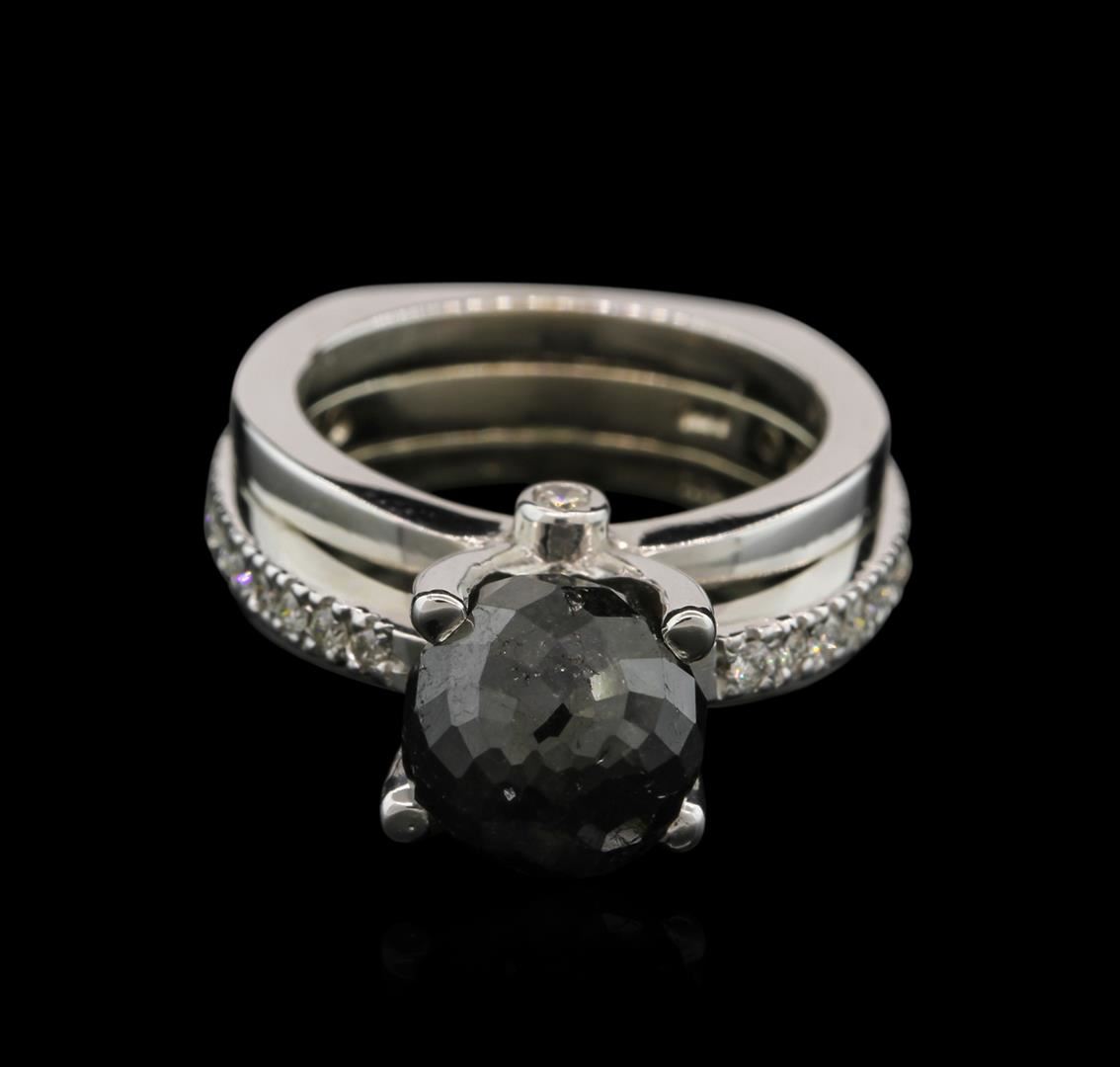 One electronically tested 14KT white gold ladies cast black and white diamond ring with a bright polish finish. The featured cathedral set black diamond is supported by a diamond accented under gallery and diamond set shoulders, completed by a six and one-half millimeter wide band. Identified with markings of "14K". Condition is good. Containing: One prong set briolette cut diamond, measuring 9.15 x 10.00 x 9.15mm (depth est.) approximate weight of 7.50ct. Indications of multiple laboratory enhancements. The specific gravity of black diamond is 3.120 to 3.165. Diamond tester results are non-reactive. Graded in the setting. Clarity Declasse,. Color: Fancy Black; Irradiated. Thirty prong & bezel set round brilliant cut diamonds, measuring 1.70 - 1.50 x 0.96mm (depth est.) approximate total weight of 30 Stones = 0.49ct. Graded in the setting. Clarity: SI-2 to I-1. Color: G - I. Total Weight of Diamonds 7.99ct. Total Weight of Ring 12.60gm. AIG Appraised at $10,085.00.