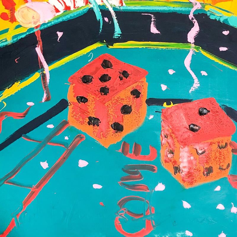 "7 Come 11" is an original oil painting on stretched canvas by Paul Blaine Henrie (1932-1999). The piece is hand signed by the artist and comes with a letter of authenticity. Please note that due to the age of this piece and the way it was stored, there are minor sings of wear, particularly on the corners and edges. Measures approximately. 48" x 30" (image).