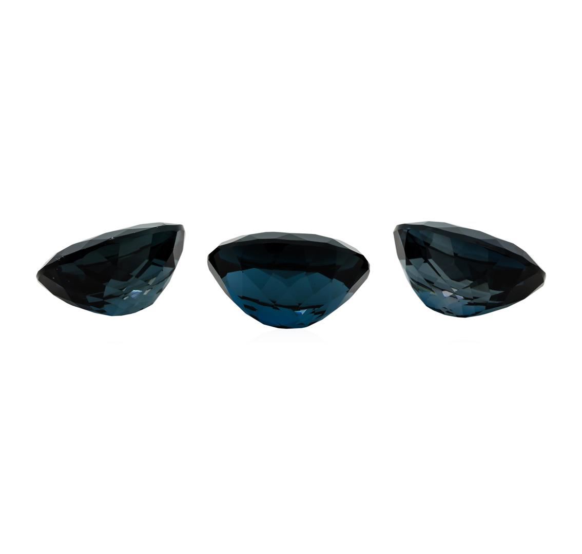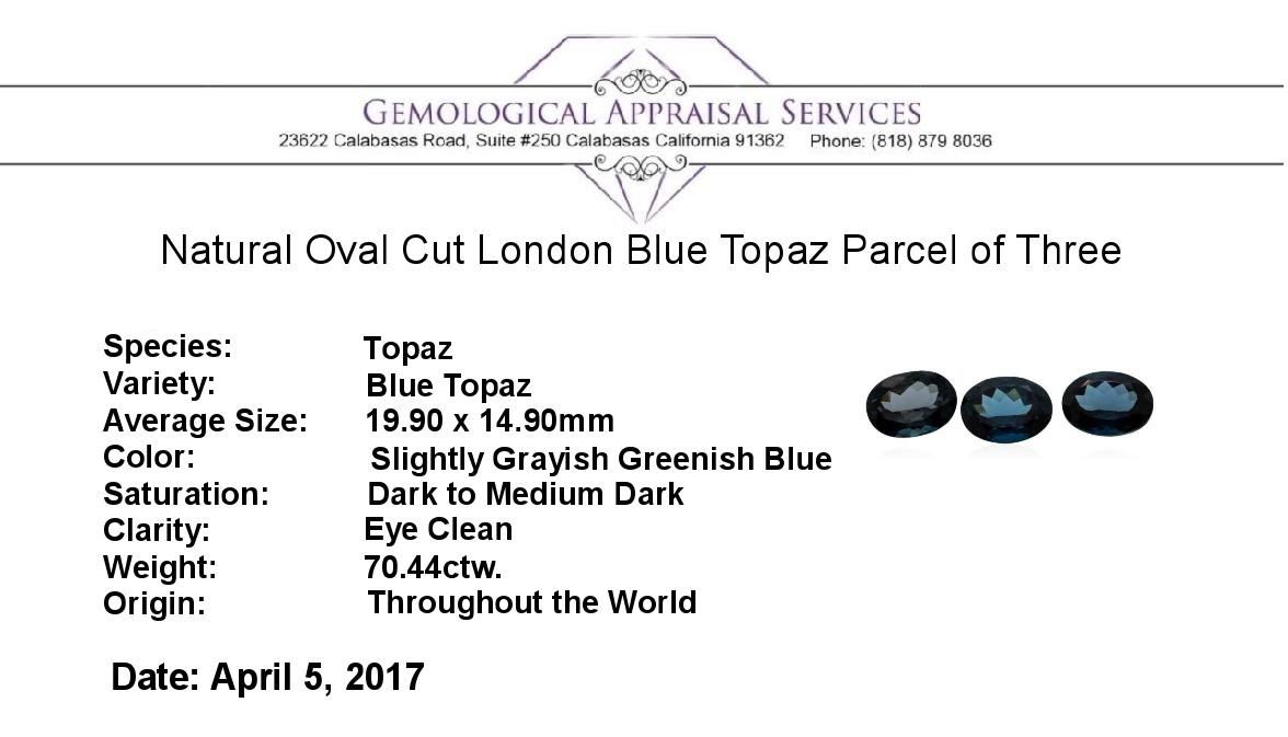 One natural oval cut london blue topaz parcel of three with an exact weight of 70.44ctw., clarity is eye clean, slightly grayish greenish blue, dark to medium dark. Gemological Appraisals Services estimates the retail value at $1408.8 GAS Appraised.
