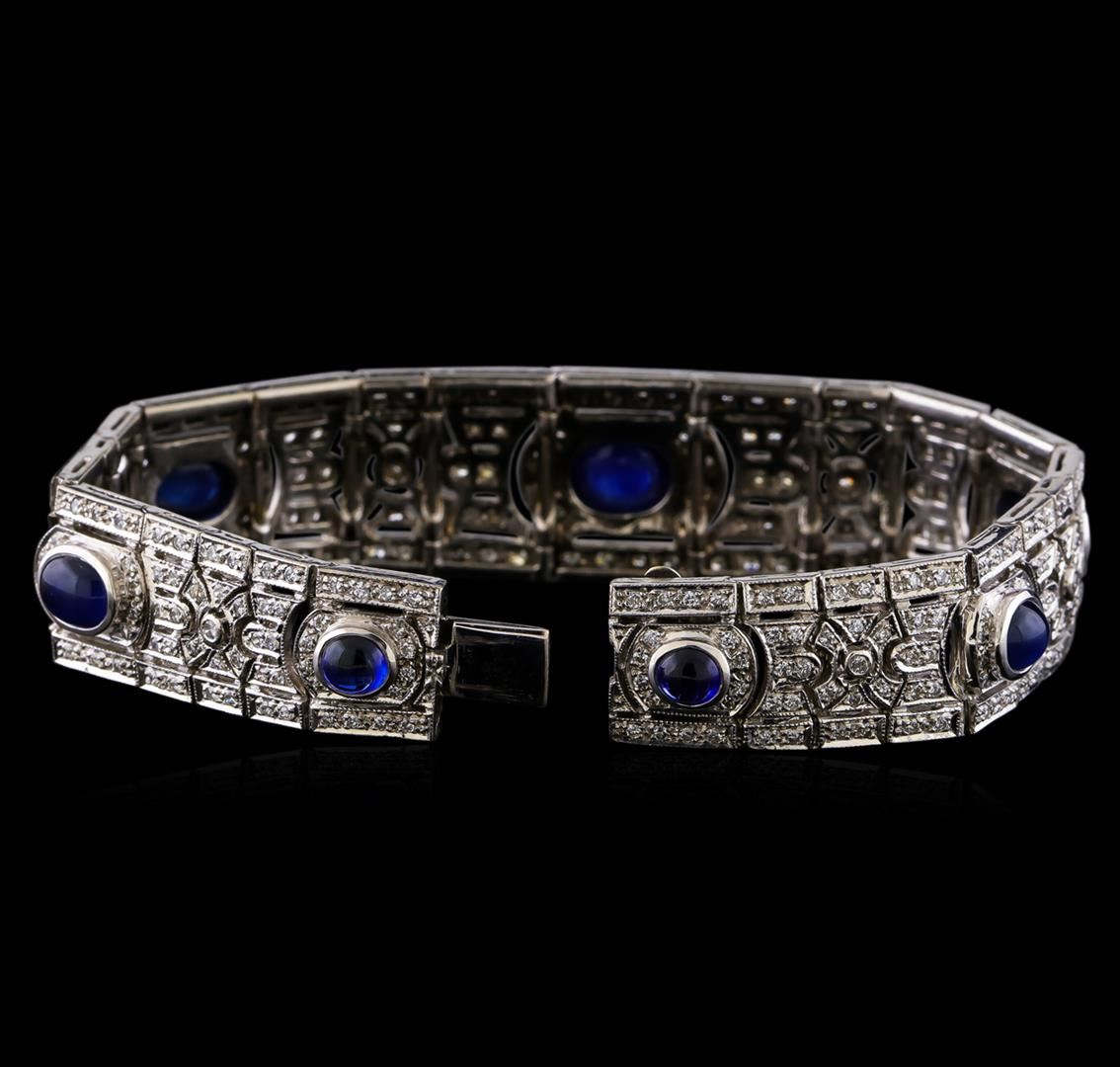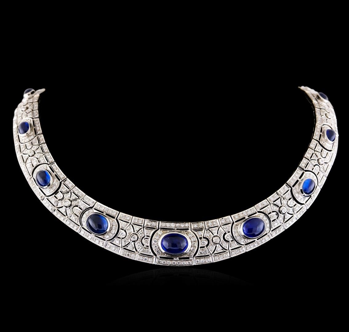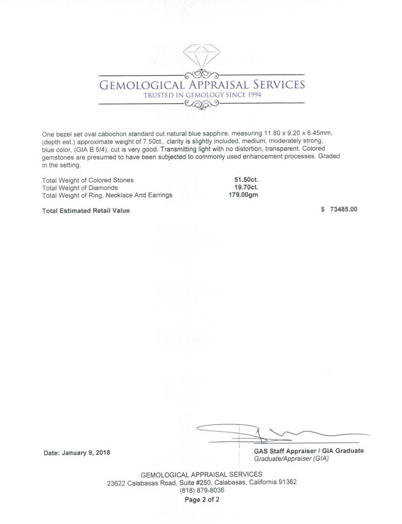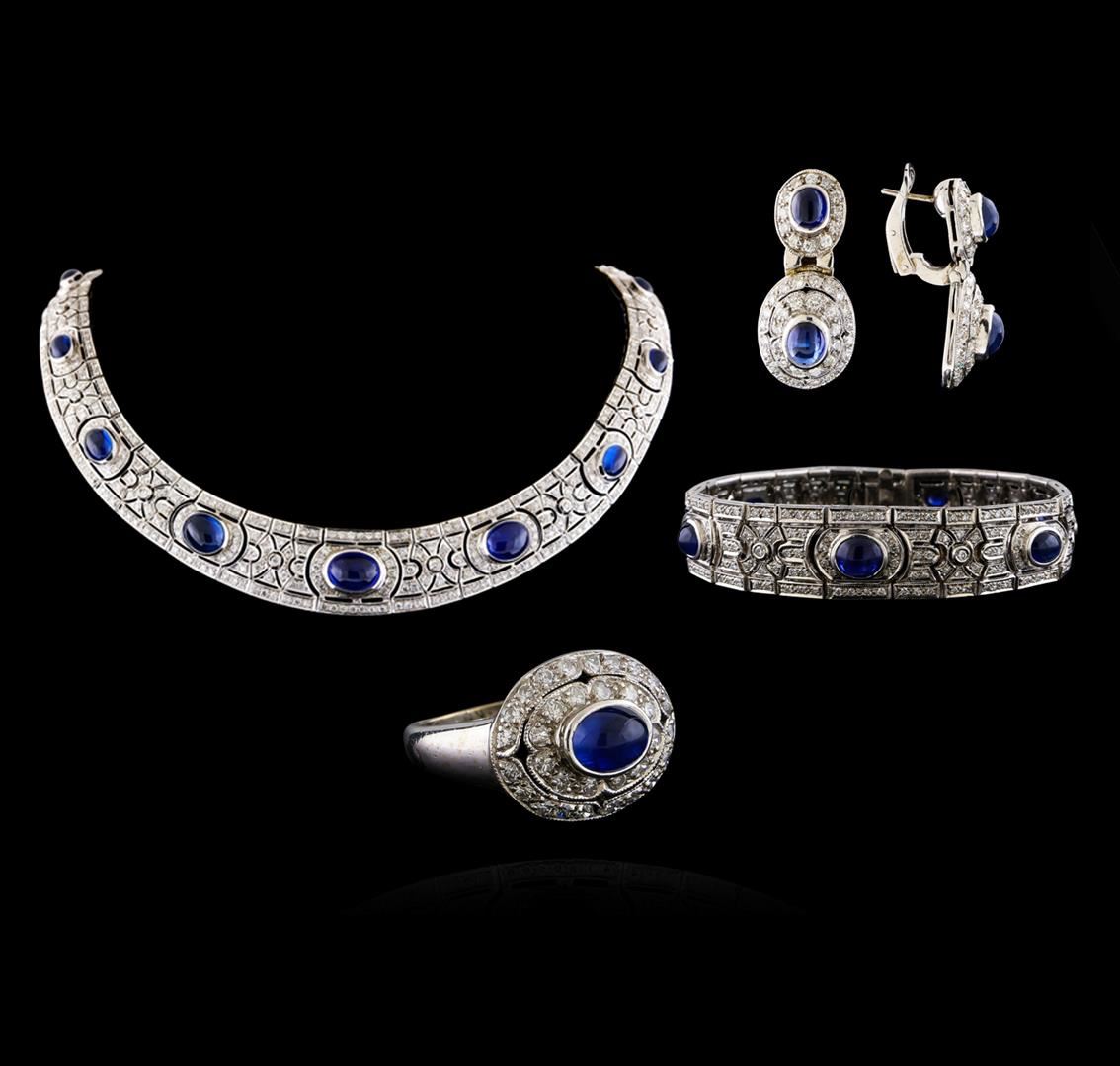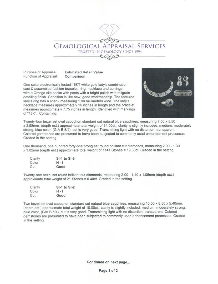 One suite electronically tested 18KT white gold lady's combination cast & assembled fashion bracelet, ring, necklace and earrings with a Omega clip backs with posts with a bright polish with milgrain detailing finish. The featured lady's ring has a shank measuring 1.90 millimeters wide. The lady's necklace measures approximately 16 inches in length and the bracelet measures approximately 7.75 inches in length. Identified with markings of '18K'. Condition is like new, good workmanship. Containing: Twenty-four bezel set oval cabochon standard cut natural blue sapphires, measuring 7.00 x 5.50 x 3.58mm, (depth est.) approximate total weight of 34.00ct., clarity is slightly included, medium, moderately strong, blue color, (GIA B 5/4), cut is very good. Transmitting light with no distortion, transparent. Colored gemstones are presumed to have been subjected to commonly used enhancement processes. Graded in the setting. One Thousand, One Hundred Forty-One prong set round brilliant cut diamonds, measuring 2.00 - 1.30 x 1.02mm (depth est.) approximate total weight of 1141 Stones = 19.30ct. Graded in the setting. Color H - I Clarity SI-1 to SI-3 Cut Good Twenty-One bezel set round brilliant cut diamonds, measuring 2.00 - 1.40 x 1.05mm (depth est.) approximate total weight of 21 Stones = 0.40ct. Graded in the setting. Color H - I Clarity SI-1 to SI-2 Cut Good Two bezel set oval cabochon standard cut natural blue sapphires, measuring 10.00 x 8.50 x 5.40mm, (depth est.) approximate total weight of 10.00ct., clarity is slightly included, medium, moderately strong, blue color, (GIA B 5/4), cut is very good. Transmitting light with no distortion, transparent. Colored gemstones are presumed to have been subjected to commonly used enhancement processes. Graded in the setting. One bezel set oval cabochon standard cut natural blue sapphire, measuring 11.80 x 9.20 x 6.45mm, (depth est.) approximate weight of 7.50ct., clarity is slightly included, medium, moderately strong, blue color, (GIA B 5/4), cut is very good. Transmitting light with no distortion, transparent. Colored gemstones are presumed to have been subjected to commonly used enhancement processes. Graded in the setting. Total Weight of Colored Stones 51.50ct.. Total Weight of Diamonds 19.70ct.. Total Weight of Ring, Necklace And Earrings 179.00gm GAS Appraised at $73485.00. GAS Appraised.