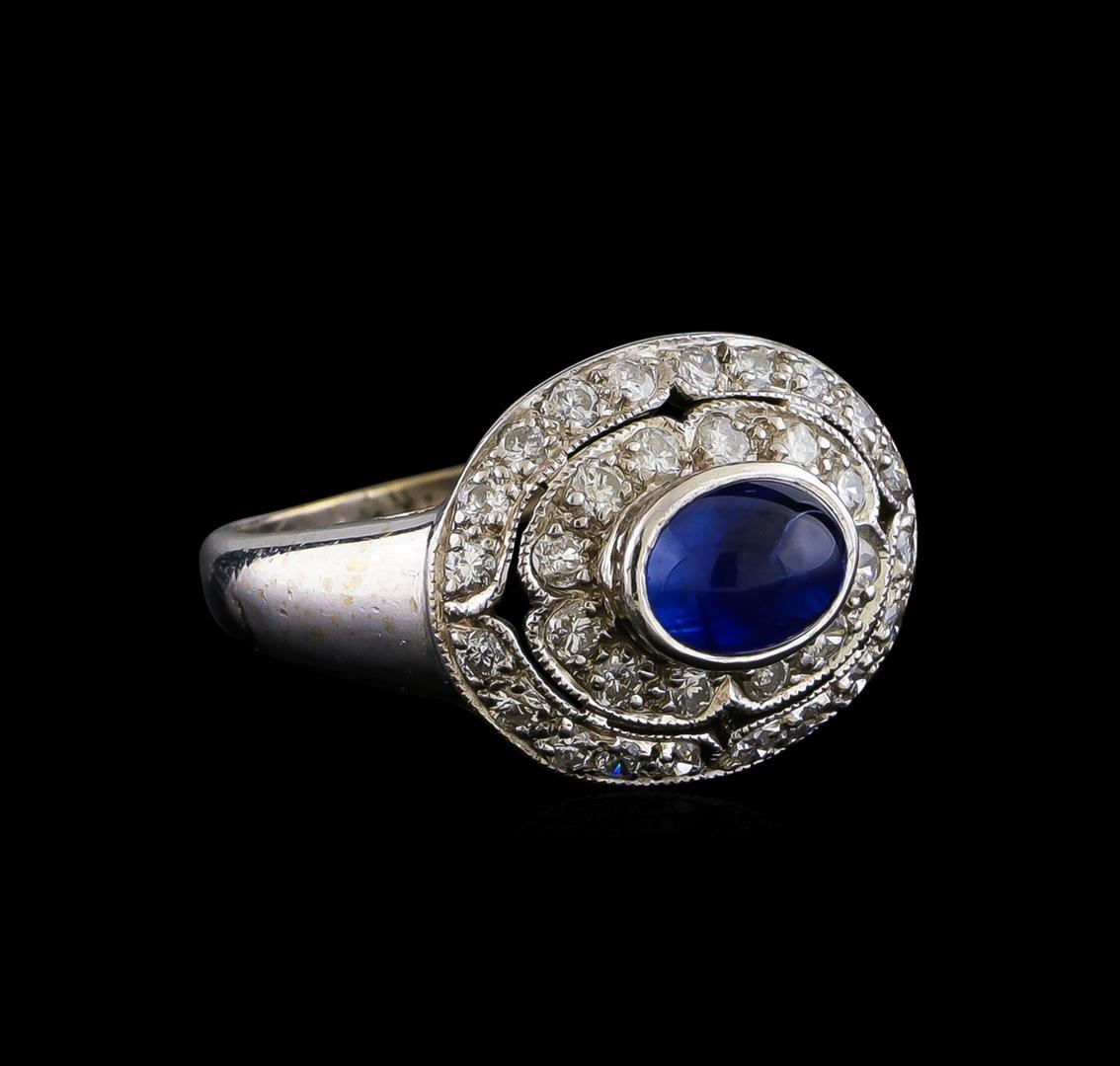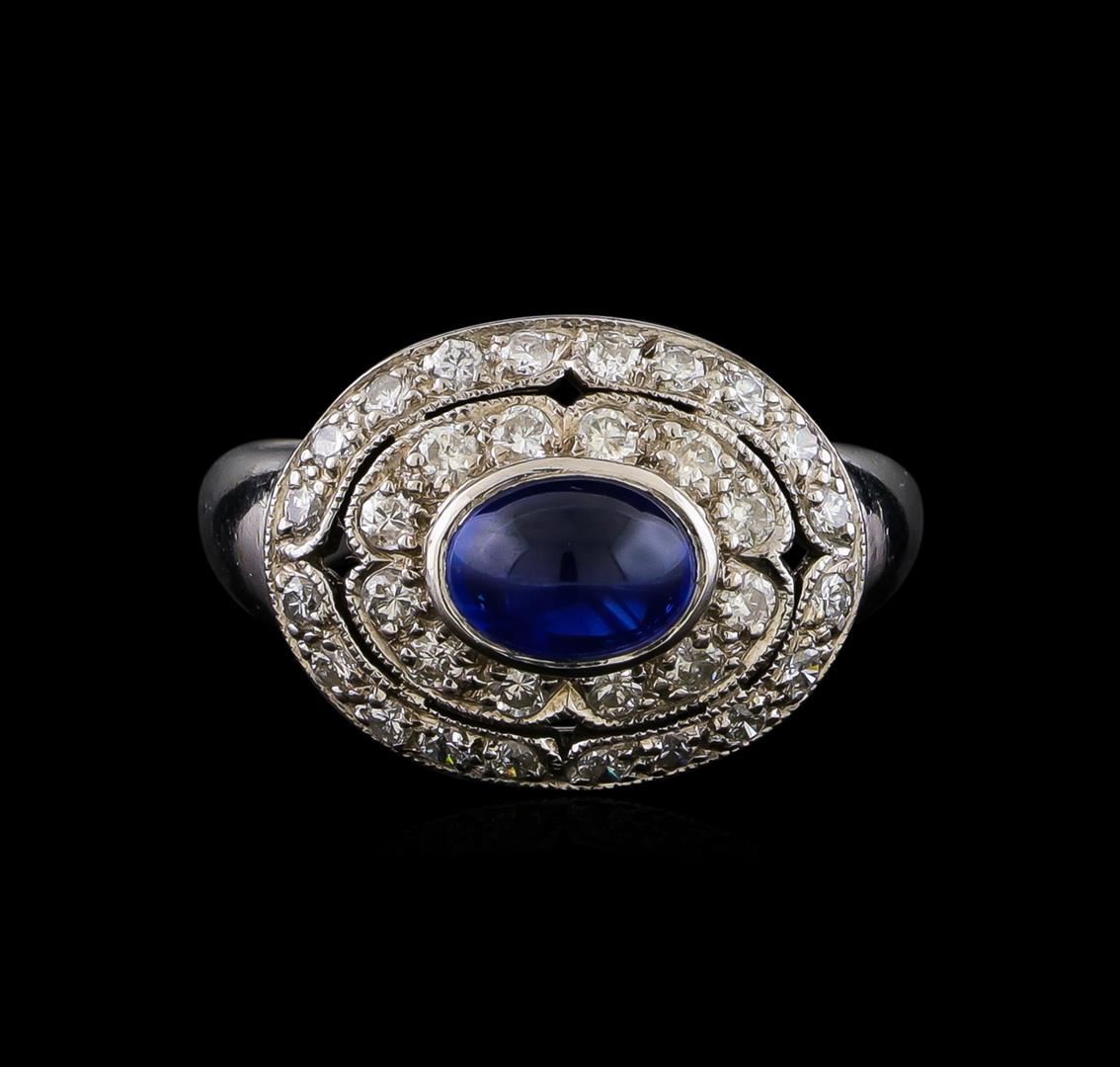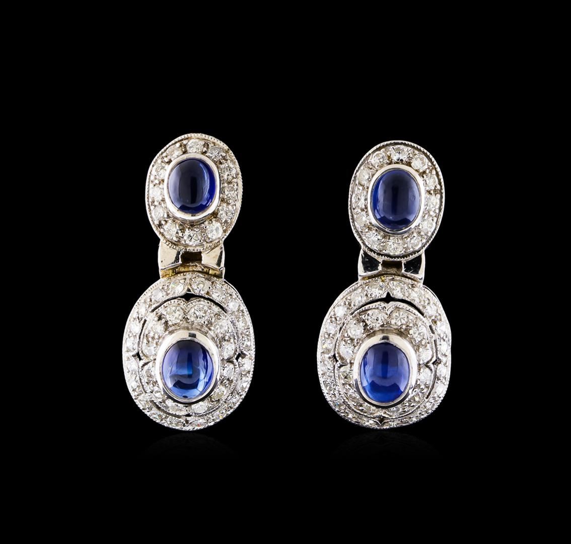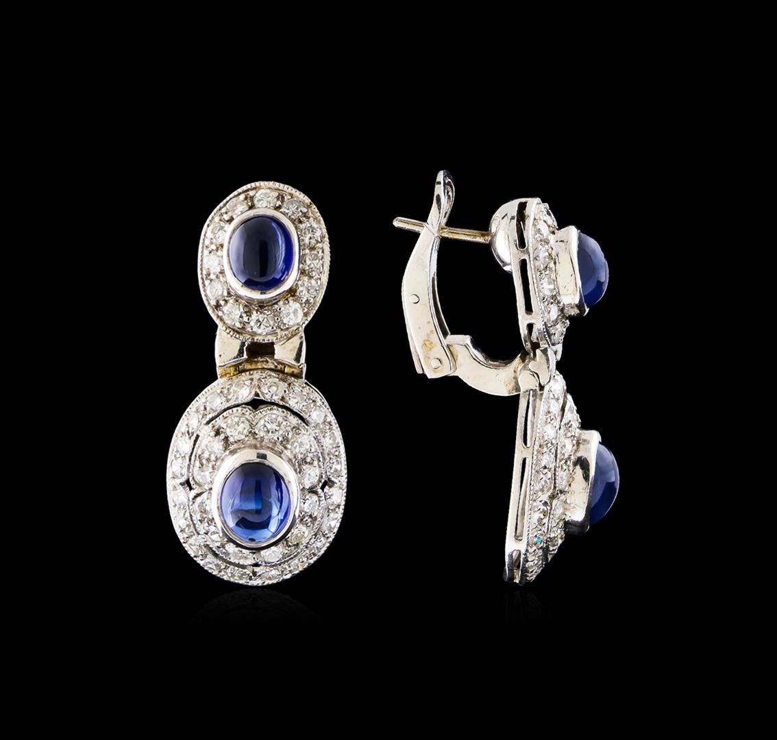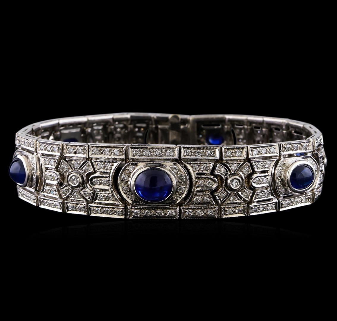 One suite electronically tested 18KT white gold lady's combination cast & assembled fashion bracelet, ring, necklace and earrings with a Omega clip backs with posts with a bright polish with milgrain detailing finish. The featured lady's ring has a shank measuring 1.90 millimeters wide. The lady's necklace measures approximately 16 inches in length and the bracelet measures approximately 7.75 inches in length. Identified with markings of '18K'. Condition is like new, good workmanship. Containing: Twenty-four bezel set oval cabochon standard cut natural blue sapphires, measuring 7.00 x 5.50 x 3.58mm, (depth est.) approximate total weight of 34.00ct., clarity is slightly included, medium, moderately strong, blue color, (GIA B 5/4), cut is very good. Transmitting light with no distortion, transparent. Colored gemstones are presumed to have been subjected to commonly used enhancement processes. Graded in the setting. One Thousand, One Hundred Forty-One prong set round brilliant cut diamonds, measuring 2.00 - 1.30 x 1.02mm (depth est.) approximate total weight of 1141 Stones = 19.30ct. Graded in the setting. Color H - I Clarity SI-1 to SI-3 Cut Good Twenty-One bezel set round brilliant cut diamonds, measuring 2.00 - 1.40 x 1.05mm (depth est.) approximate total weight of 21 Stones = 0.40ct. Graded in the setting. Color H - I Clarity SI-1 to SI-2 Cut Good Two bezel set oval cabochon standard cut natural blue sapphires, measuring 10.00 x 8.50 x 5.40mm, (depth est.) approximate total weight of 10.00ct., clarity is slightly included, medium, moderately strong, blue color, (GIA B 5/4), cut is very good. Transmitting light with no distortion, transparent. Colored gemstones are presumed to have been subjected to commonly used enhancement processes. Graded in the setting. One bezel set oval cabochon standard cut natural blue sapphire, measuring 11.80 x 9.20 x 6.45mm, (depth est.) approximate weight of 7.50ct., clarity is slightly included, medium, moderately strong, blue color, (GIA B 5/4), cut is very good. Transmitting light with no distortion, transparent. Colored gemstones are presumed to have been subjected to commonly used enhancement processes. Graded in the setting. Total Weight of Colored Stones 51.50ct.. Total Weight of Diamonds 19.70ct.. Total Weight of Ring, Necklace And Earrings 179.00gm GAS Appraised at $73485.00. GAS Appraised.