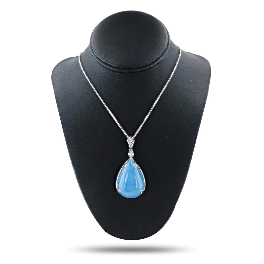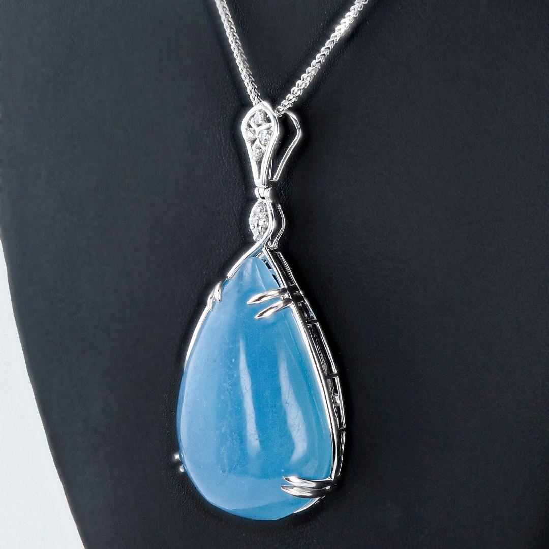 One polished, stamped, and tested platinum pendant marked Oscar Friedman. The pendant mounted with: 1 genuine aquamarine center stone weighing approximately 73.00 carat, and 8 genuine round diamonds weighing approximately 0.17 carats. The pendant hangs from a platinum link chain measuring 18 inches in length. This item weighs 33.6 grams, condition is new, excellent workmanship. #MAIN GEMSTONE# Species: Natural Beryl; Variety: Aquamarine; Shape: Pear; Cutting Style: Cabochon; Measurements: 38.1 x 26.8 x 10.7mm; Weight: 73.00 carat; Color: Light Blue; Cut Grade: Very Good; Refractive Index: 1.577 to 1.583 DR; Birefringence: 0.005 - 0.009; Hardness: 7.5 - 8 #ADJACENT GEMSTONES ON PENDANT# Identity: Natural Diamond; Shape: Round; Cutting Style: Brilliant Cut; Quantity: 8 Diamonds; Measurements: 1.7mm; Total Weight: 0.17 carats; Clarity Grade: SI1; Color Grade: G; Refractive Index: 2.417; Hardness: 10; AQUAMARINE WEIGHT: 73.00 ct; TOTAL DIAMOND WEIGHT: 0.17 cts; WEIGHT OF ITEM: 33.6 grams; METAL: Platinum #Size: 18