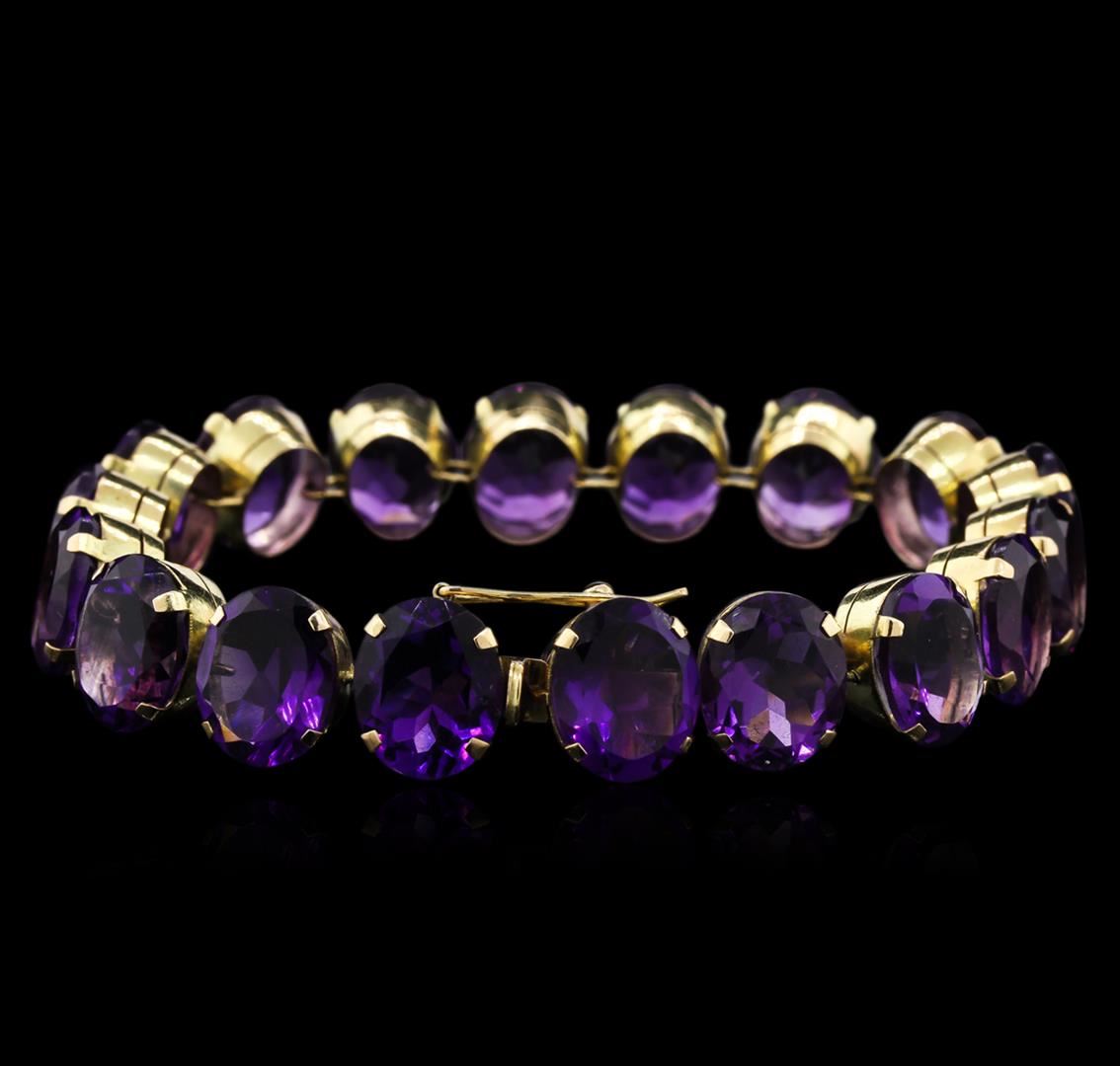 One electronically tested 14KT yellow gold lady's combination cast & assembled straight line bracelet with a tongue clasp with foldover safety with a bright polish finish. The featured lady's bracelet measures 7.25 inches in length. Condition is used, good workmanship. Containing: Eighteen prong set oval modified mixed cut natural amethysts, measuring 12.00 x 9.85 x 6.40mm, approximate. Total Weight of 76.14ct., clarity is eye clean, type II, medium dark, moderately strong, purple color, (GIA P 6/4), cut is very good. Colored gemstones are presumed to have been subjected to commonly used enhancement processes. Transmitting light with no distortion, transparent. Graded in the setting. Total Weight of Colored Stones 76.14ct. Total Weight of Bracelet 27.60gm. GAS Appraised.