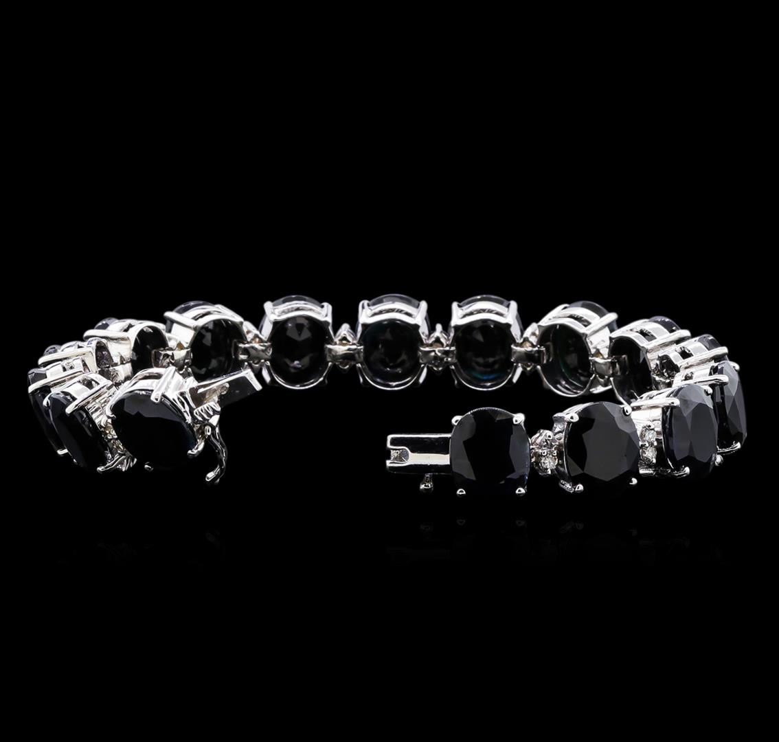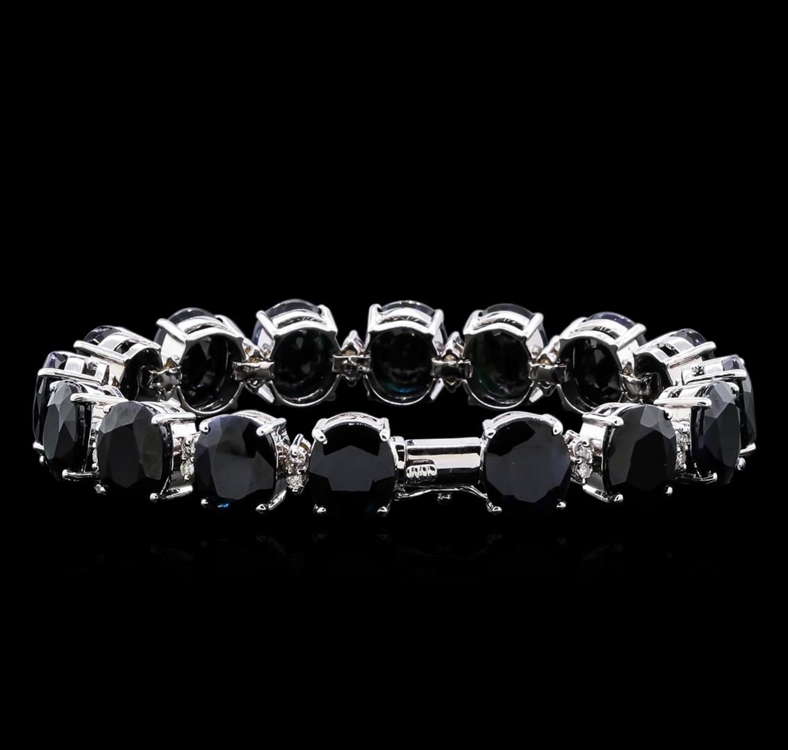 One ladies Jaqu Lili bracelet with genuine natural color sapphires and diamonds well made in solid white gold. Total item width 11mm, height 7mm. Condition is new, good workmanship. Stamped 14k and logo. Containing: Sixteen oval shaped sapphires weighing approximately 77.74ctw. Color: Dark blue. Clarity: Clean. The bracelet also contains thirty round shaped diamonds weighing approximately 1.16ctw. Color: H-J. Clarity: SI2-SI3. Total Weight of Gemstones: 78.90ctw. Total Item Weight: 39.4 grams. IGL Appraised.