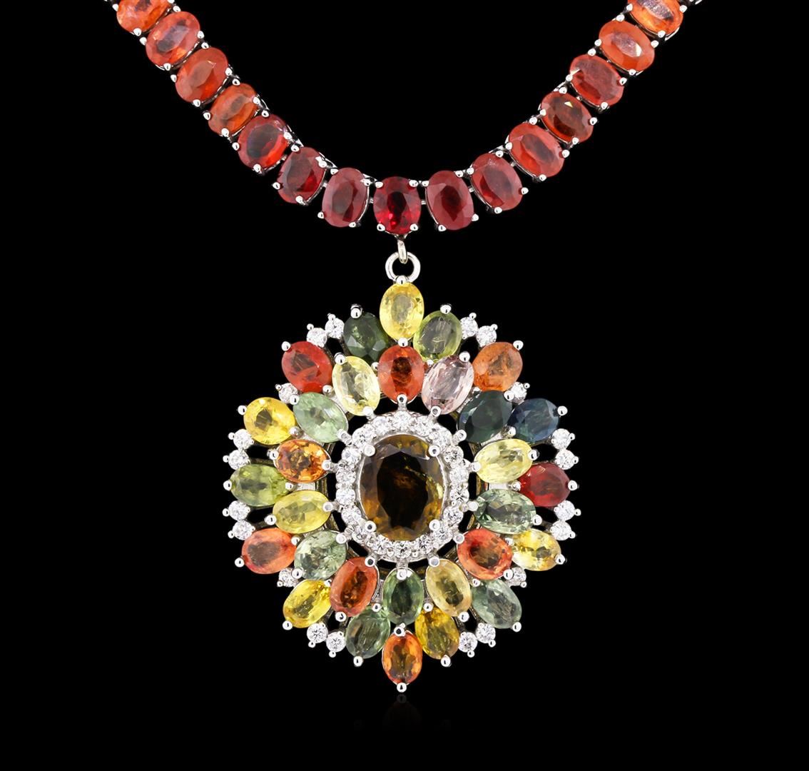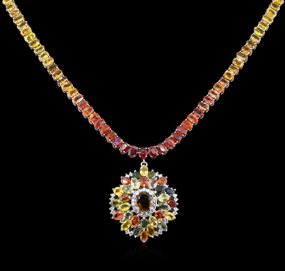 One electronically tested 14KT white gold lady's combination cast & assembled fashion necklace with a tongue clasp with foldover safety with a bright polish finish. Condition is new, good workmanship. The featured lady's necklace measures approximately 17 inches in length. Identified with markings of "14K". Containing: One prong set oval modified brilliant cut natural orange sapphire, measuring 10.72 x 7.95 x 3.55mm, approximate weight of 2.54ct., clarity is slightly included, type II, dark, slightly brownish, yellowish orange color, (GIA yO 7/2), cut is good. Transmitting light somewhat diffusely, transparent to translucent. Naturally occurring internal & external characteristics are present. Colored gemstones are presumed to have been subjected to commonly used enhancement processes. Graded in the setting. One hundred twenty-six prong set oval modified brilliant cut natural multi-color sapphires, measuring 6.00 x 4.20 x 2.73mm, 5% bulge factor, approximate total weight of 77.00ct., clarity is slightly included, cut is good. Transmitting light somewhat diffusely, transparent to translucent. Colored gemstones are presumed to have been subjected to commonly used enhancement processes. Graded in the setting. The featured sapphires range in hue from yellow to orange to orangy red to green to blue. Thirty-eight prong set round brilliant cut diamonds, measuring 2.00 1.90 x 1.19mm (depth est.) approximate total weight of 38 stones = 1.05ct. Graded in the setting. Clarity: SI-1 to I-1. Color: H-I. Cut: Good. Total Weight of Colored Stones: 79.54ct, Total Weight of Diamonds: 1.05ct. Total Weight of Necklace: 50.70 grams. GAS Appraised at $18,200.00.