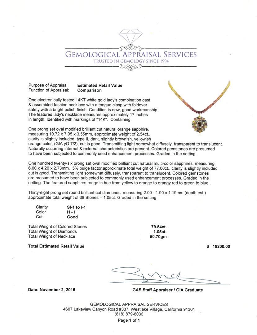 One electronically tested 14KT white gold lady's combination cast & assembled fashion necklace with a tongue clasp with foldover safety with a bright polish finish. Condition is new, good workmanship. The featured lady's necklace measures approximately 17 inches in length. Identified with markings of "14K". Containing: One prong set oval modified brilliant cut natural orange sapphire, measuring 10.72 x 7.95 x 3.55mm, approximate weight of 2.54ct., clarity is slightly included, type II, dark, slightly brownish, yellowish orange color, (GIA yO 7/2), cut is good. Transmitting light somewhat diffusely, transparent to translucent. Naturally occurring internal & external characteristics are present. Colored gemstones are presumed to have been subjected to commonly used enhancement processes. Graded in the setting. One hundred twenty-six prong set oval modified brilliant cut natural multi-color sapphires, measuring 6.00 x 4.20 x 2.73mm, 5% bulge factor, approximate total weight of 77.00ct., clarity is slightly included, cut is good. Transmitting light somewhat diffusely, transparent to translucent. Colored gemstones are presumed to have been subjected to commonly used enhancement processes. Graded in the setting. The featured sapphires range in hue from yellow to orange to orangy red to green to blue. Thirty-eight prong set round brilliant cut diamonds, measuring 2.00 1.90 x 1.19mm (depth est.) approximate total weight of 38 stones = 1.05ct. Graded in the setting. Clarity: SI-1 to I-1. Color: H-I. Cut: Good. Total Weight of Colored Stones: 79.54ct, Total Weight of Diamonds: 1.05ct. Total Weight of Necklace: 50.70 grams. GAS Appraised at $18,200.00.