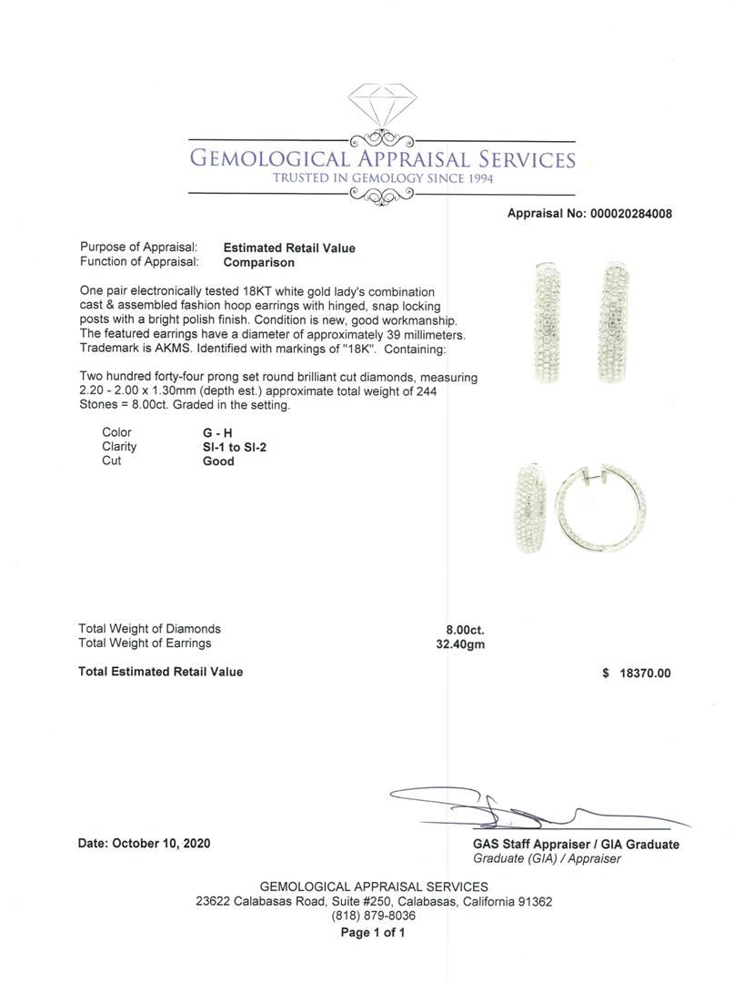 One pair electronically tested 18KT white gold lady's combination cast & assembled fashion hoop earrings with hinged, snap locking posts with a bright polish finish. The featured earrings have a diameter of approximately 39 millimeters. Trademark is AKMS. Identified with markings of '18K'. Condition is new, good workmanship. Containing: Two Hundred Forty-Four prong set round brilliant cut diamonds, measuring 2.20 - 2.00 x 1.30mm (depth est.) approximate total weight of 244 Stones = 8.00ct. Graded in the setting. Color G - H Clarity SI-1 to SI-2 Cut Good. Total Weight of Diamonds 8.00ct.. Total Weight of Earrings 32.40gm GAS Appraised at $18370.00. GAS Appraised.
