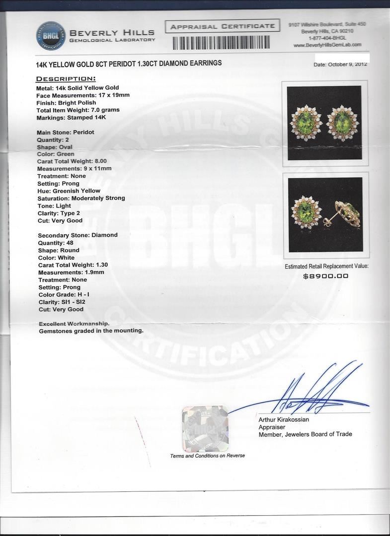 One 14KT yellow gold 8.00ct peridot and diamond earrings. Metal: 14KT solid yellow gold. Face Measurements: 17 x 19mm. Finish: Bright polish. Total Item Weight: 7.0 grams. Markings: Stamped 14K. Country Made: USA. Containing: 2 oval Peridots with a total weight of 8.00ct. Measuring: 9 x 11mm. Color: Green. Treatment: None. Setting: Prong. Saturation: Moderately strong. Tone: Light. Clarity: Type 2. Cut: Very good. The peridots are complemented by 48 round Diamonds with a total weight of 1.30ct. Measuring: 1.9mm. Treatment: None. Setting: Prong. Color Grade: H - I. Clarity: SI1 - SI2. Cut: Very good. Excellent workmanship. Gemstones graded in the setting. BHGL Appraised at $8,900.00.