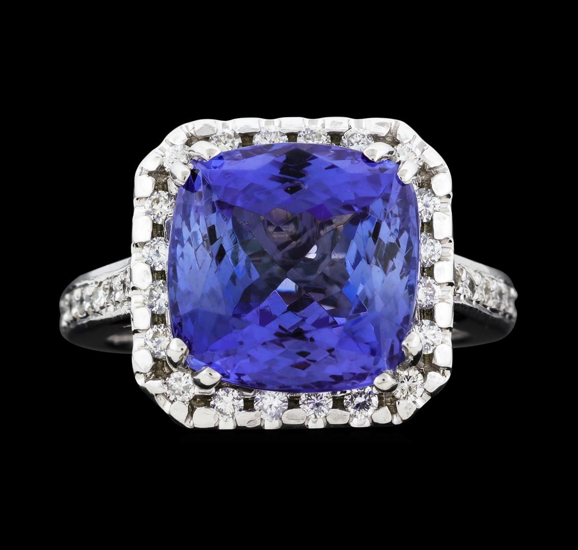 One electronically tested 14KT white gold lady's cast fashion ring with a cathedral cushion halo with a bright polish finish. The featured lady's ring has a shank measuring 2.54 millimeters wide. Identified with markings of '14K'. Condition is new, good workmanship. Containing: One prong set square cushion modified brilliant cut natural tanzanite, measuring 11.04 x 11.00 x 8.00mm, (depth est.) 5%. bulge factor, approximate weight of 8.00ct., clarity is eye clean, medium, moderately strong, violetish blue color, (GIA vB 5/4), cut is very good. Transmitting light with no distortion, transparent. Colored gemstones are presumed to have been subjected to commonly used enhancement processes. Graded in the setting. Twenty prong set round brilliant cut diamonds, measuring 1.60 - 1.50 x 0.93mm (depth est.) approximate total weight of 20 Stones = 0.27ct. Graded in the setting. Clarity SI-1 to SI-3. Color: H - I Cut Good Fourteen prong set round brilliant cut diamonds, measuring 1.40 - 1.35 x 0.86mm (depth est.) approximate total weight of 14 Stones = 0.14ct. Graded in the setting. Clarity SI-1 to SI-2. Color: H - I Cut Good Sixteen prong set round brilliant cut diamonds, measuring 1.15 - 1.05 x 0.68mm (depth est.) approximate total weight of 16 Stones = 0.08ct. Graded in the setting. Clarity SI-1 to SI-3. Color: H - I Cut Good. Total Weight of Colored Stones 8.00ct.. Total Weight of Diamonds 0.49ct.. Total Weight of Ring 8.60gm. GAS Appraised at $13,060.00.