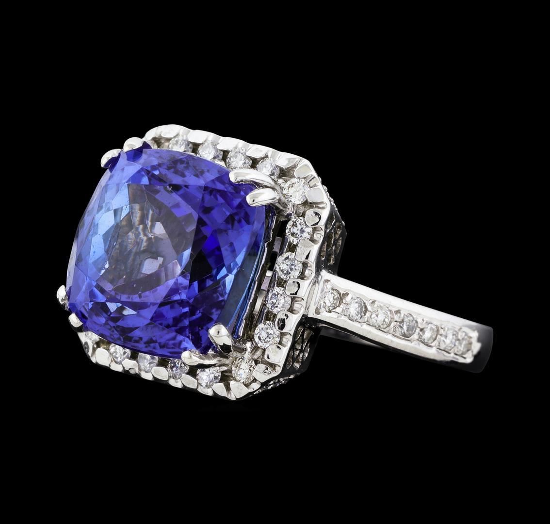 One electronically tested 14KT white gold lady's cast fashion ring with a cathedral cushion halo with a bright polish finish. The featured lady's ring has a shank measuring 2.54 millimeters wide. Identified with markings of '14K'. Condition is new, good workmanship. Containing: One prong set square cushion modified brilliant cut natural tanzanite, measuring 11.04 x 11.00 x 8.00mm, (depth est.) 5%. bulge factor, approximate weight of 8.00ct., clarity is eye clean, medium, moderately strong, violetish blue color, (GIA vB 5/4), cut is very good. Transmitting light with no distortion, transparent. Colored gemstones are presumed to have been subjected to commonly used enhancement processes. Graded in the setting. Twenty prong set round brilliant cut diamonds, measuring 1.60 - 1.50 x 0.93mm (depth est.) approximate total weight of 20 Stones = 0.27ct. Graded in the setting. Clarity SI-1 to SI-3. Color: H - I Cut Good Fourteen prong set round brilliant cut diamonds, measuring 1.40 - 1.35 x 0.86mm (depth est.) approximate total weight of 14 Stones = 0.14ct. Graded in the setting. Clarity SI-1 to SI-2. Color: H - I Cut Good Sixteen prong set round brilliant cut diamonds, measuring 1.15 - 1.05 x 0.68mm (depth est.) approximate total weight of 16 Stones = 0.08ct. Graded in the setting. Clarity SI-1 to SI-3. Color: H - I Cut Good. Total Weight of Colored Stones 8.00ct.. Total Weight of Diamonds 0.49ct.. Total Weight of Ring 8.60gm. GAS Appraised.
