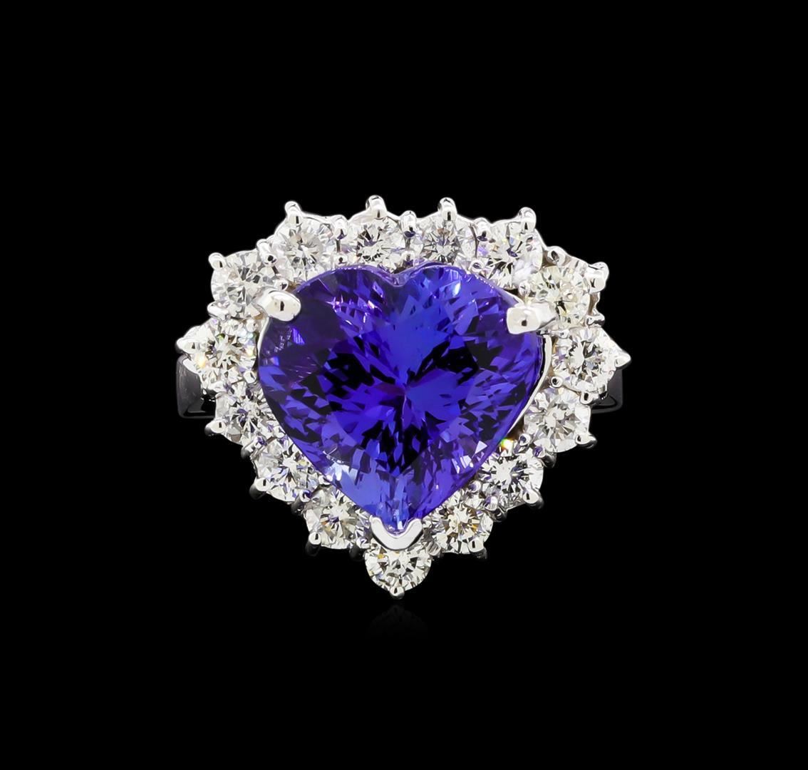One electronically tested 14KT white gold lady's combination cast & assembled heart shape ring with a basket halo with a bright polish finish. The featured lady's ring has a shank measuring 2.64 millimeters wide. Identified with markings of "14K". Condition is new, good workmanship. Containing: One prong set heart modified brilliant cut natural tanzanite, measuring 12.20 x 13.00 x 8.37mm, approximate weight of 8.00 ct., clarity is eye clean, type I, medium dark, moderately strong, violetish blue color, (GIA vB 6/4), cut is very good. Transmitting light with no distortion, transparent. Colored gemstones are presumed to have been subjected to commonly used enhancement processes. Graded in the setting. Fifteen prong set round brilliant cut diamonds, measuring 3.10 - 3.00 x 1.89mm (depth est.) approximate total weight of 15 Stones = 1.60 ct. Graded in the setting. Clarity: SI-1 to I-1. Color: H - J. Cut Good. Total Weight of Colored Stones 8.00 ct. Total Weight of Diamonds 1.60 ct. Total Weight of Ring 11.10gm. GAS Appraised.
